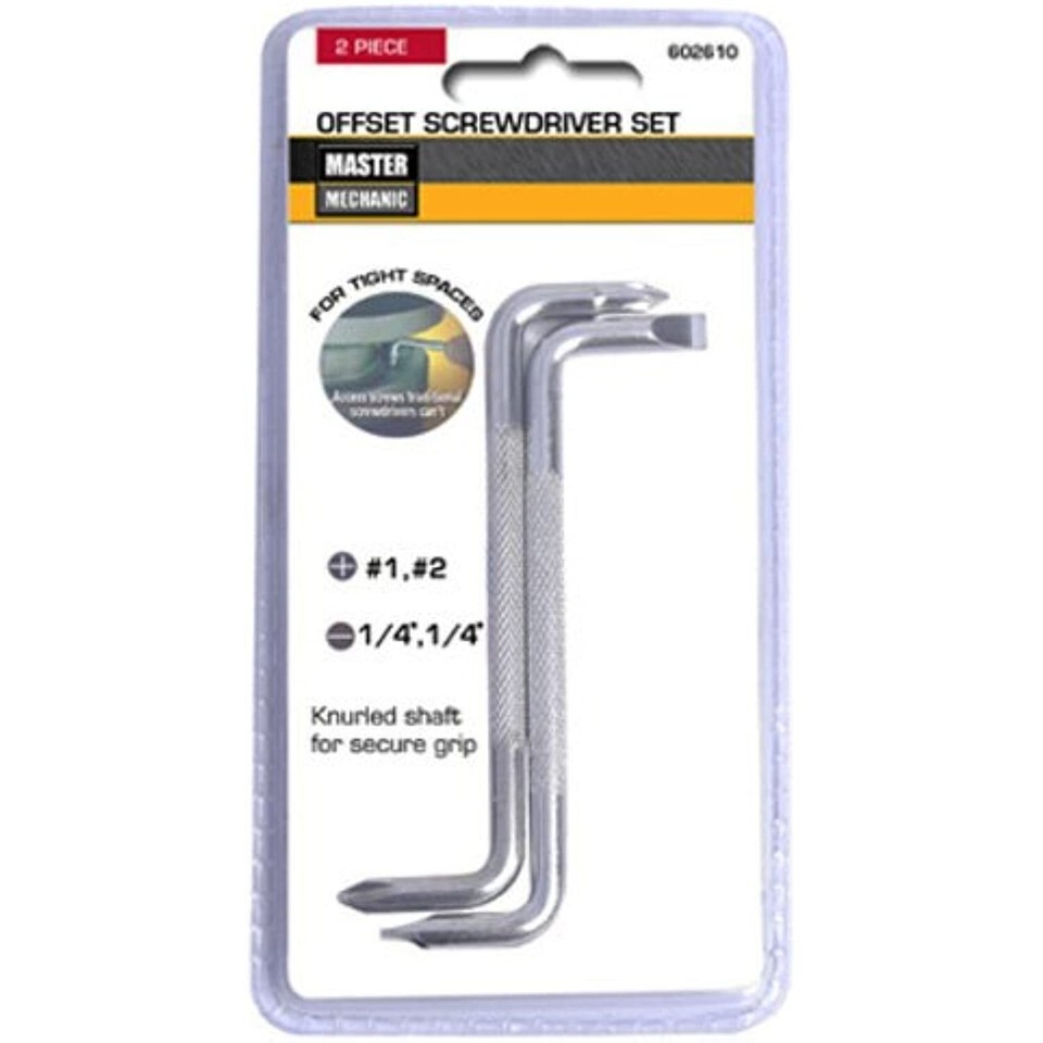 Master Mechanic, 2 piece, offset screwdriver set, includes Phillips Slotted 90 degree blade angles, for cramped hard to reach places.