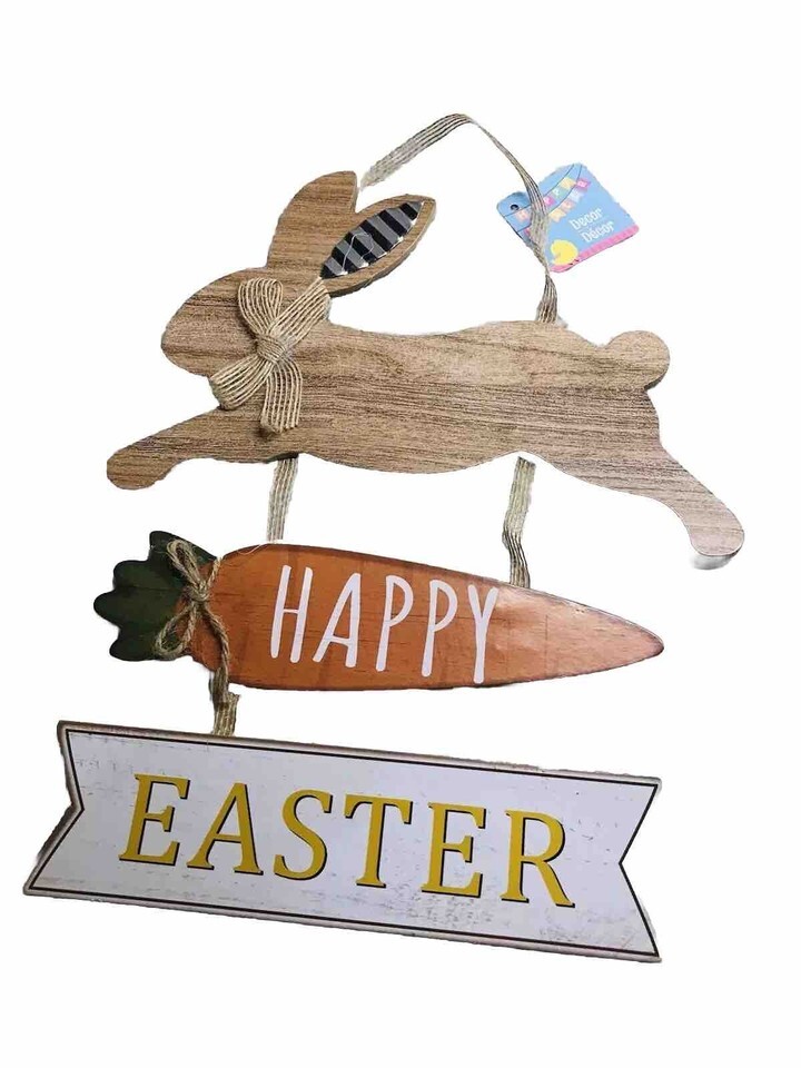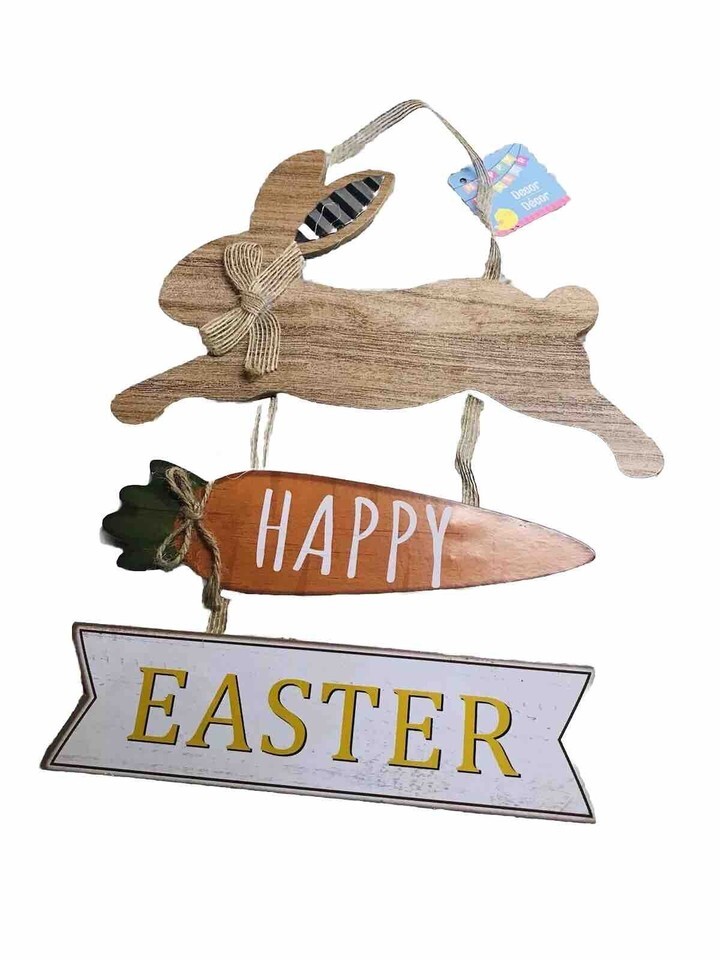 Happy Easter Wooden Hanging Sign Easter Colorful Carrot Bunny Sign Door..