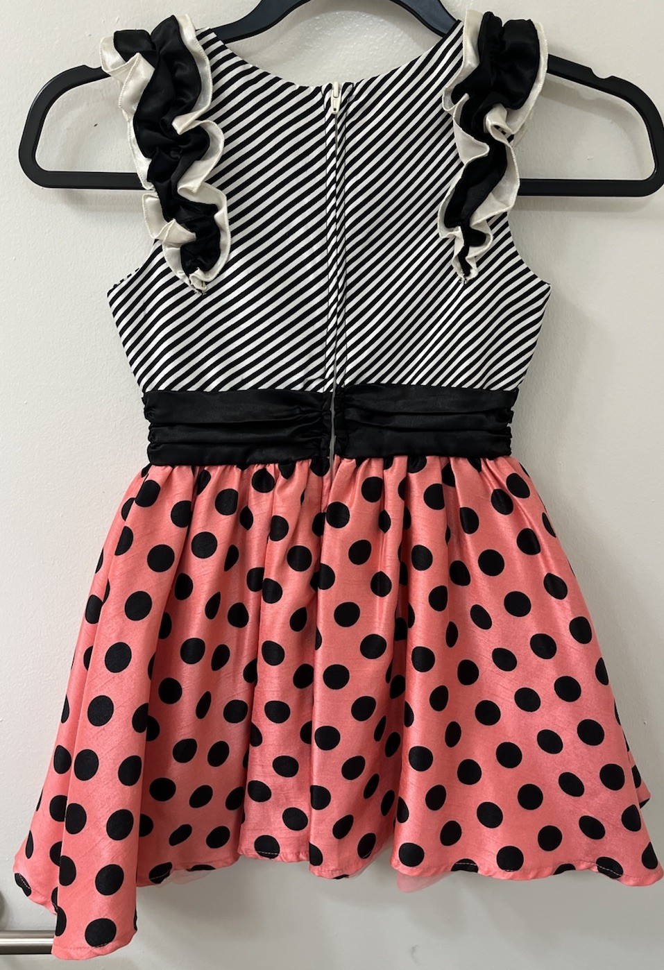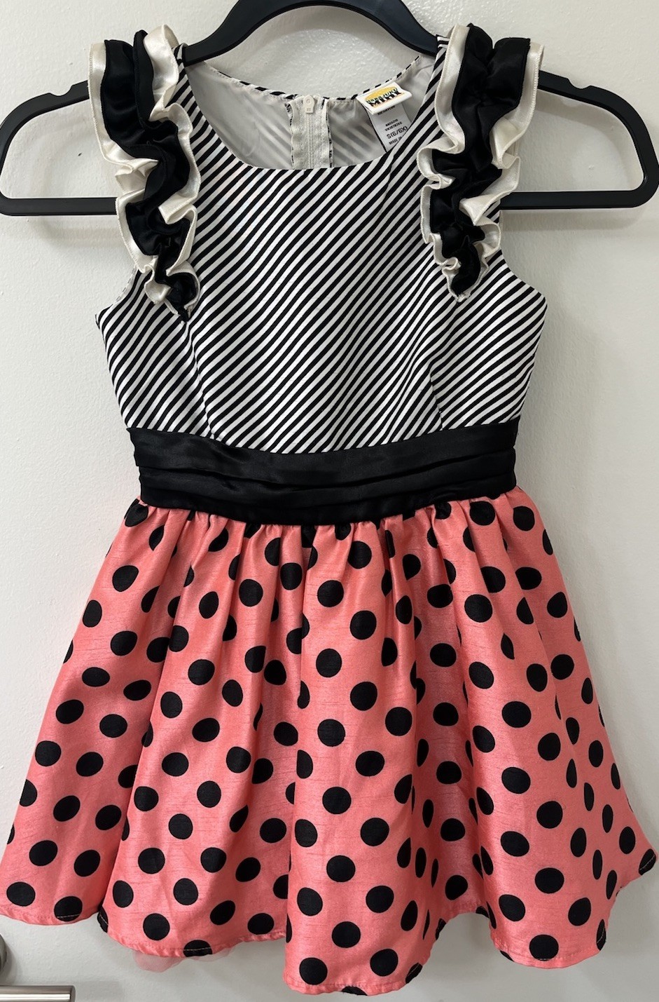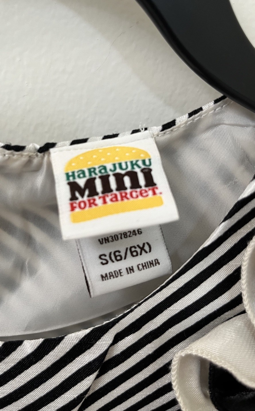 The Harajuku Mini for Target dress in size S (6-6X) is a fun and stylish option for young girls. This sleeveless pink black and white stripe polka dot dress is perfect for various occasions such as parties, holidays, and casual wear. With a colorful and festive design, this dress is ideal for the summer, fall, and spring seasons. The signature Harajuku Mini style offers a playful and trendy look that is sure to stand out and make a statement. Has a slight marker stain on the back as shown in photos. Please let me know if you have any questions!