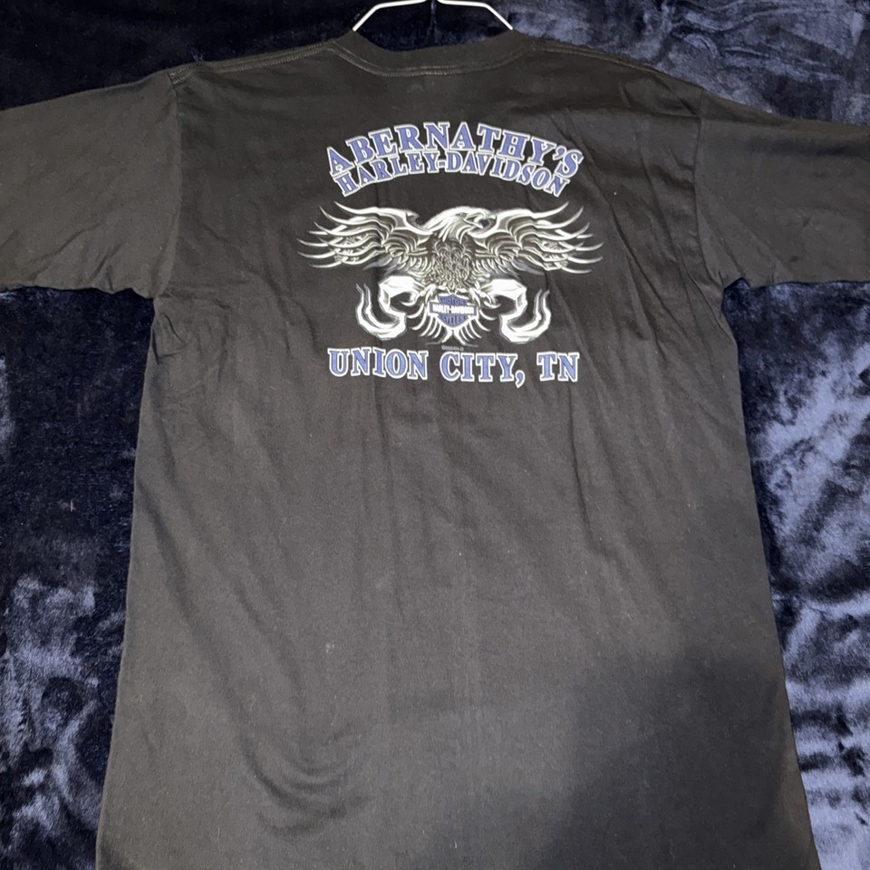 The product is a Harley Davidson 200 T-Shirt in men's size L, made in the USA with a design featuring an eagle. This black t-shirt showcases the iconic Harley-Davidson brand and is perfect for fans looking to show off their love for American culture and the popular motorcycle brand. Made in Union City, TN, this t-shirt is a must-have for any Harley enthusiast's collection.