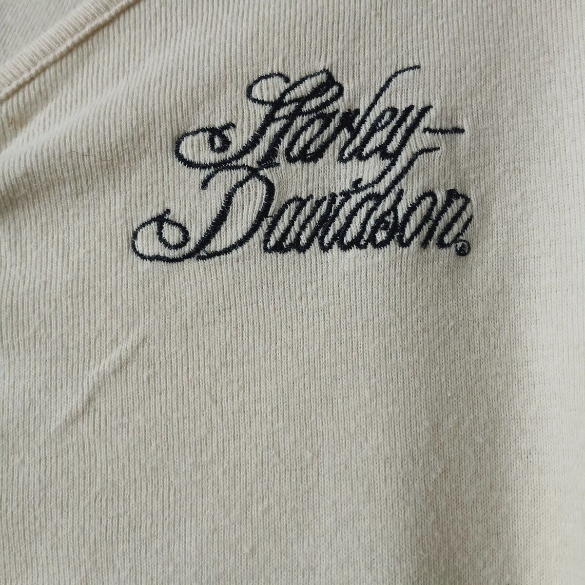 This women's Harley-Davidson shirt is a cream-colored long-sleeve t-shirt in size XL. Made of 100% cotton, it features a V-neckline with a pullover closure and embroidered accents. The shirt has a regular fit and a lightweight feel, making it suitable for casual occasions. With a motorcycle theme and the iconic Harley-Davidson brand, this basic T-shirt is a stylish choice for fans of the brand looking for a comfortable and trendy top.