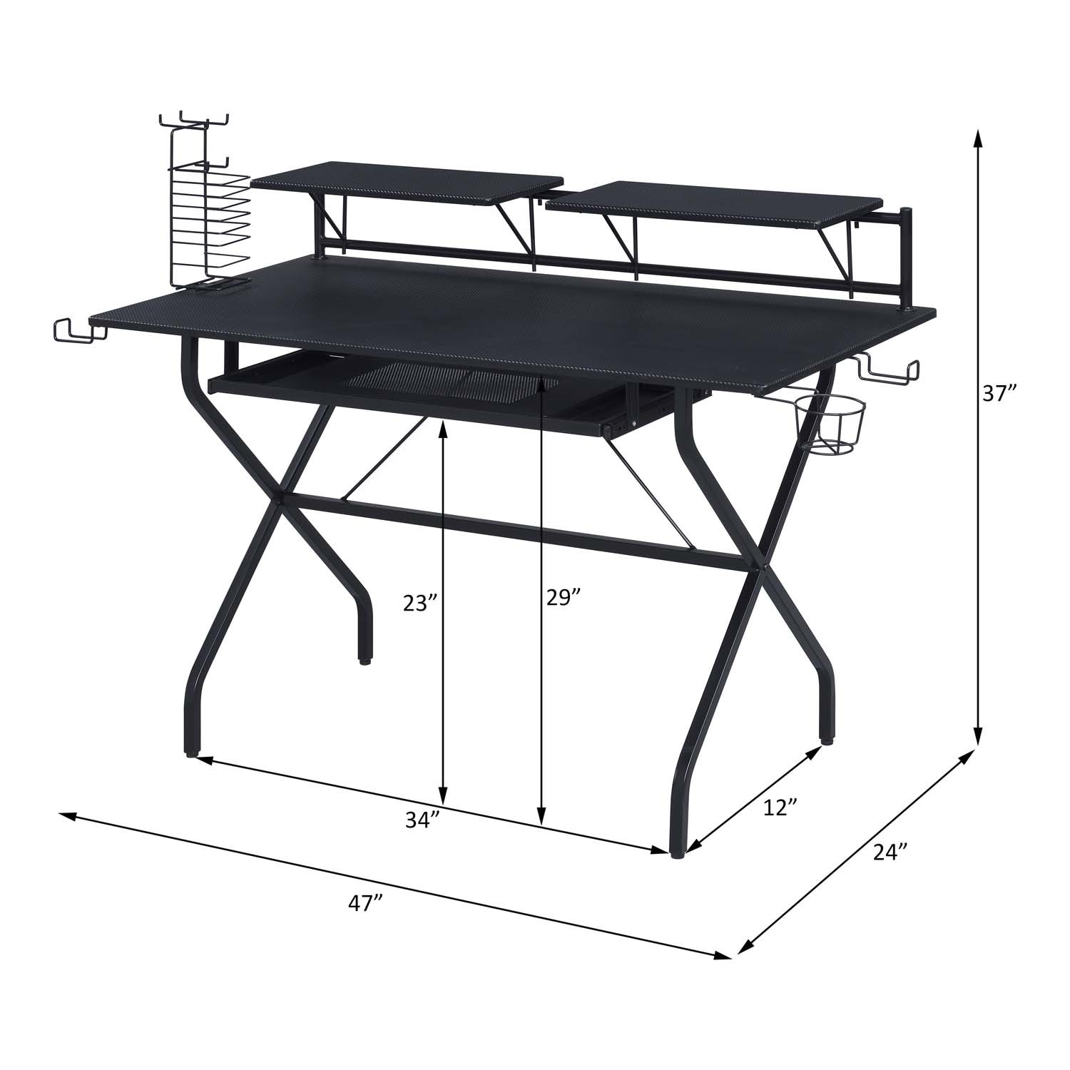 Features: Computer Desk Storage: 2 Open Compartments (Fixed, 2 Wooden Shelves) Keyboard Tray, Media Rack Cup-Holder Wooden Top/Shelf/Keyboard Tray Metal Frame Base Media Rack (Back Open) Set Includes: One (1) Gaming Desk