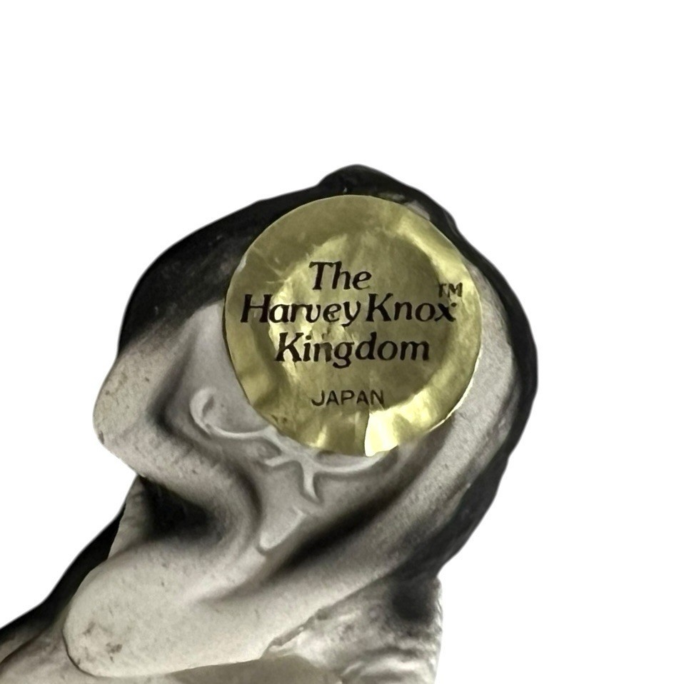 Adorable Harvey Knox Kingdom pig figurine made in Japan. This vintage ceramic piece features a glossy black and white finish with expressive detailing and large ears, characteristic of Harvey Knox?s collectible animal line.