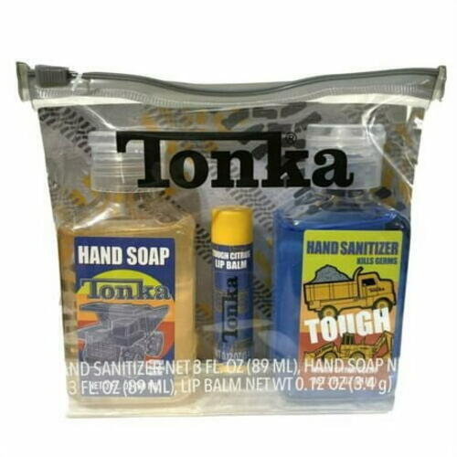 Hasbro Kids 3 pc Tonka Hygiene Travel Bag Set. Hand Soap, Lip Balm and hand sanitizer. Tough citrus scent.