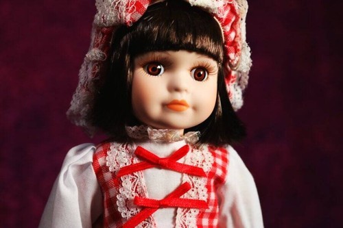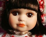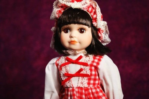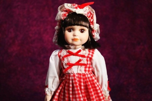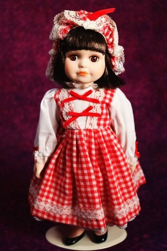 You will be receiving a beautiful porcelain doll. Cirtza is around 8-10 inches tall. Her body is stuffed with her head, neck, arms, and legs are made of porcelain. She has short brown hair topped with a bonnet. She has piercing brown eyes. She is wearing a red plaid, and white dress with ribbons and frills.
