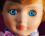You will be receiving a beautiful porcelain doll. Nova is around 14-16 inches tall. Her body is stuffed and her head, neck, arms, and legs are made of porcelain. She has short blonde hair held in an updo. She has the brightest blue eyes. And she is wearing a violet dress with pink ribbons and white frills.