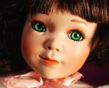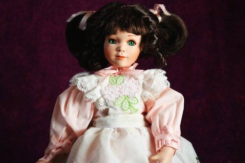 You will be receiving a beautiful porcelain doll. Sorphius is around 14-16 inches tall. Her body is stuffed with her head, neck, arms, and legs are made of porcelain. She has short, curled brown hair held in pigtails. She has striking green eyes. And she is wearing a pink and white dress with flower patterns and frills.