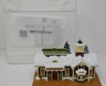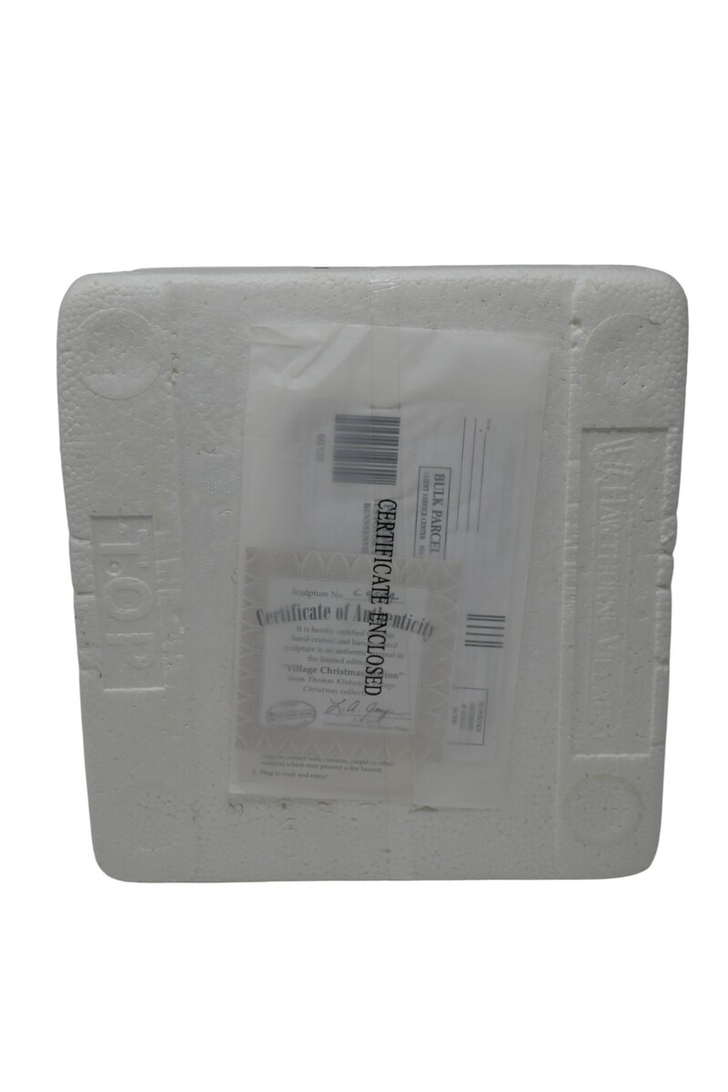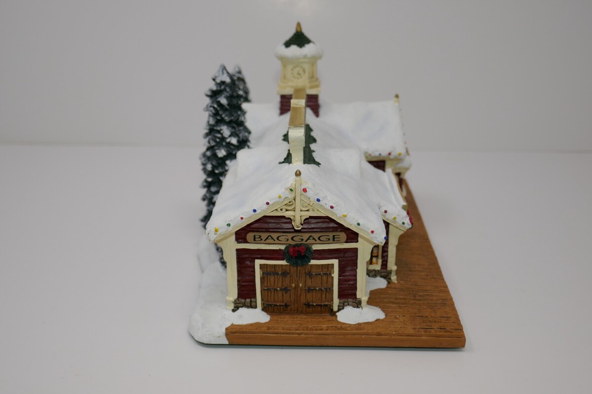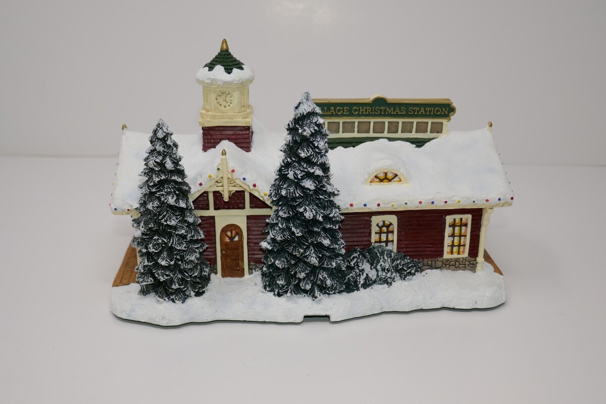 The Hawthorne Village 2001 Thomas Kinkade Village Christmas Station is a medium-sized, asymmetrical resin house featuring Christmas village decor. This collectible piece, part of the Hawthorne Village collection, is illuminated and comes in the original styrofoam, making it a charming addition to any room during the holiday season.