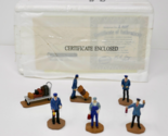 The Hawthorne Village 2005 All Aboard Figures are a set of 6 small, hand-painted resin figures depicting people working on a railroad. Manufactured by Hawthorne Village in 2005, these figures come in the original styrofoam with certificate of authenticity. Perfect for any room during the holiday season, these collectibles are part of the Hawthorne Village collection and have a theme centered around a 21st-century railroad village.
