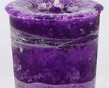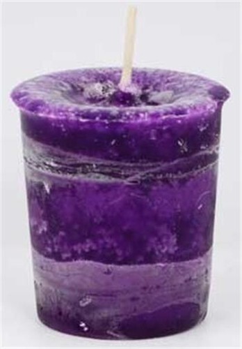 This 2 inch tall, purple, votive candle has also been imbued with the layered fragrance of lemon balm, cedar, and heather. Made in the U.S. by Crystal Journey Candles.