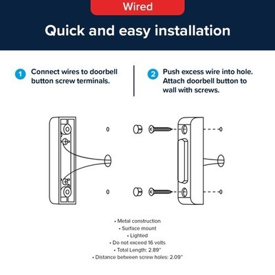 - Heath Zenith 18000216 Wired Push Doorbell Button, Black, Metal, Lighted, Surfac