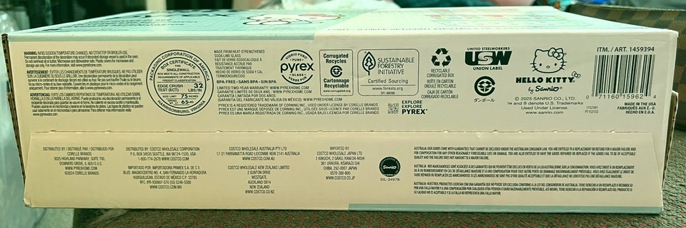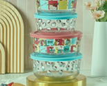 This product is a set of 4 Hello Kitty Pyrex glass food storage containers with 4 lids, totaling 8 pieces. The round bowls feature a glossy finish and are decorated with the popular Hello Kitty pattern in multicolor. Made in America in 2022, these dishwasher, microwave, and freezer-safe containers are perfect for all occasions and are part of the Disney-themed Stitch product line by PYREX. With a manufacturer warranty of 2 years and being machine washable up to 140F, these break-resistant bowls offer both functionality and style.