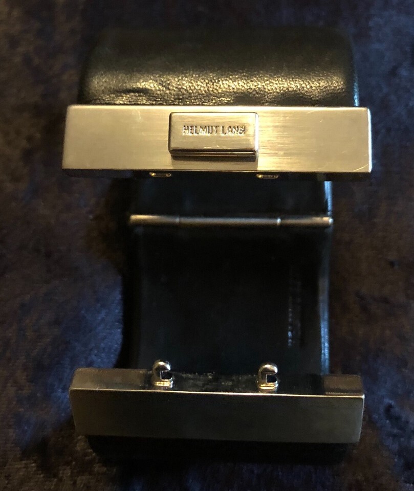 Vintage Helmut Lang Leather and Metal Cuff Bracelet from 2004. Amazing piece with clip lock closure with HL logo release button. Black leather. Excellent vintage condition. Unisex piece - ovoid shape with axes measuring 2.5? x 1.75?