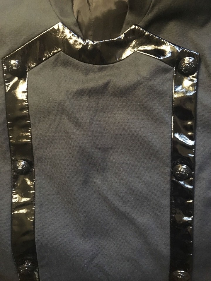 This is a great Helmut Lang coat. Classic Vintage piece from the late 90s or early 2000s. Black cotton coat with patent leather front trim and decorative buttons. Front closes with hidden snaps under the front placket (the buttons are not functional). Crew neck and side welt pockets. 98% cotton, 2% elastane, 100% leather trim. Excellent condition.