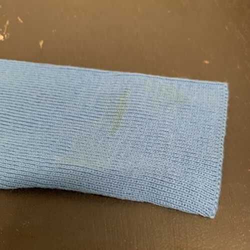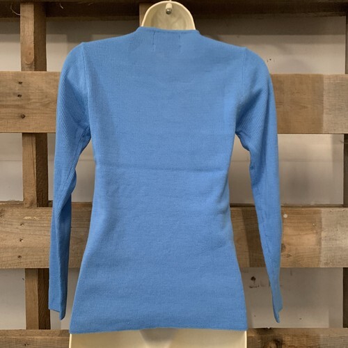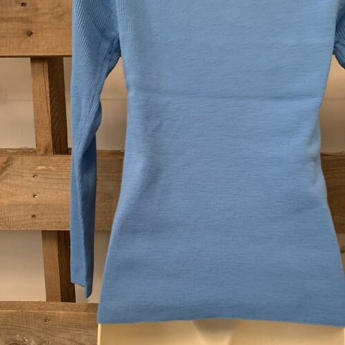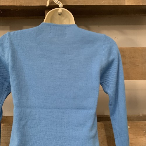 Excellent condition. Small stain on bottom of left sleeve. Blue pullover with crew neck and long sleeves.