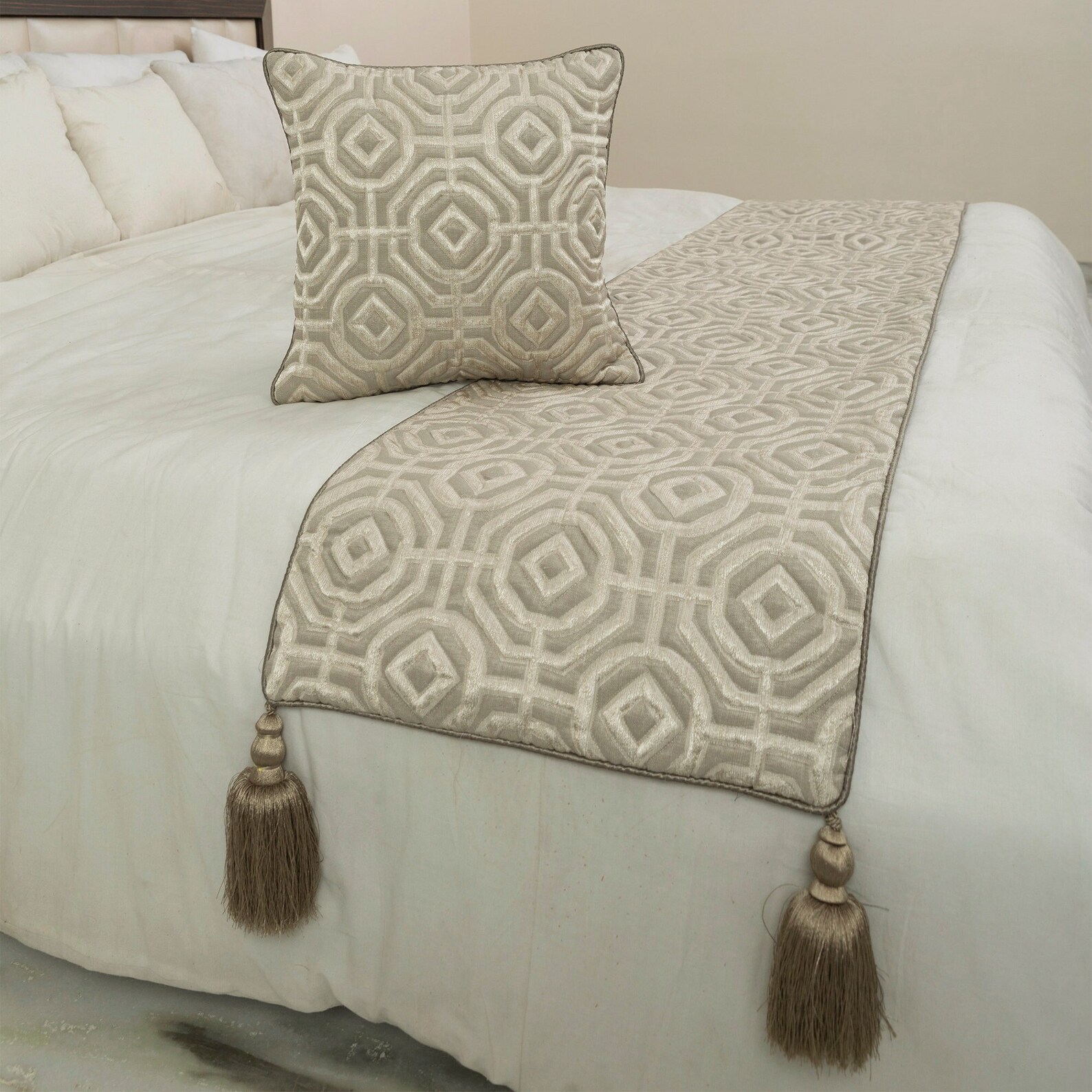 - Hexagonal Norma - Jacquard Beige Decorative Bed Runner and Pillow Cover