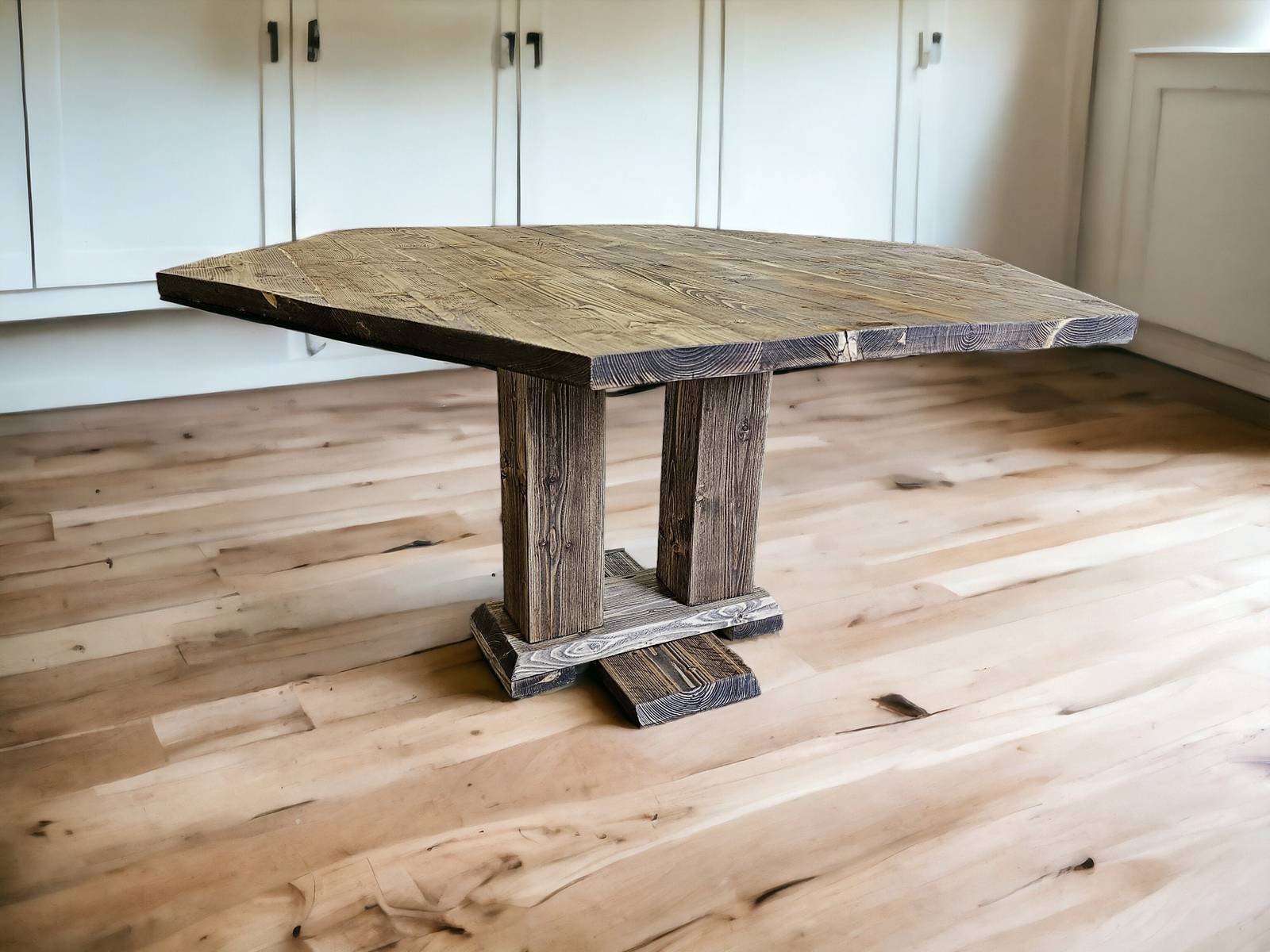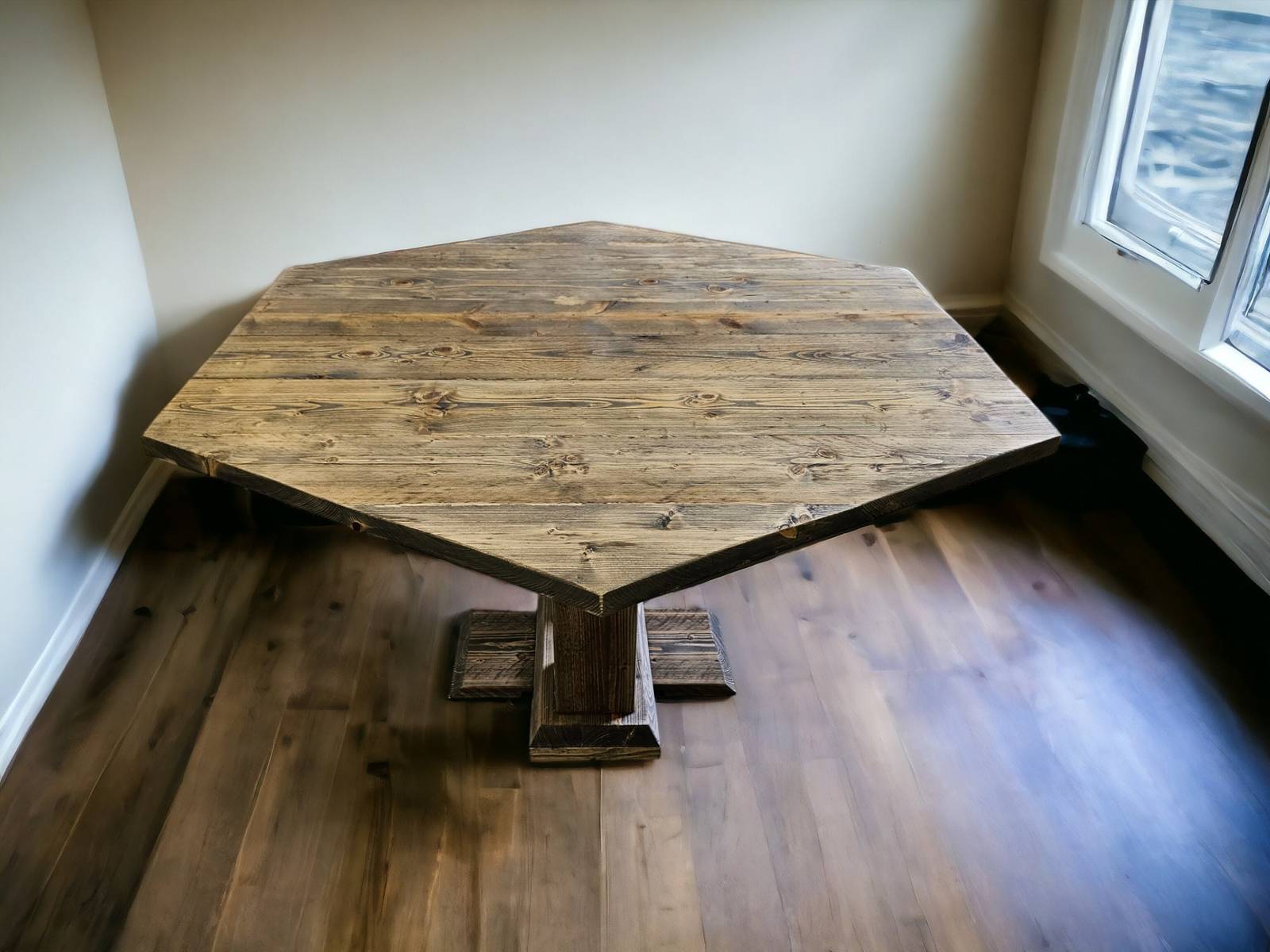 This unique hexagonal table, masterfully crafted from reclaimed scaffold boards, exudes rustic charm and sustainable elegance. Its distinct shape and rich, weathered texture make it a standout piece for any room.