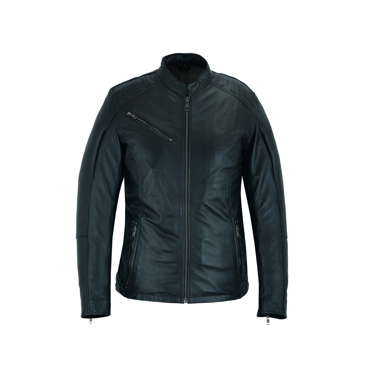 Fringe on the back of each sleeve Adorned with rivets down the middle of the back from the top to the waist. Rivets around each front pocket at the waist. 3 Zippered pockets on the front, 2 side slash pockets at the waist, and 1 across the breast Zippers on each sleeve for easy on and off around gloves Zippered vents on each sleeve Zip-out liner as well as a mesh liner underneath the zip-out one 2 Zippers on the back to make adjustments to the fit Gun pocket on the inside on the left with ammo holder. Inside drop pocket to keep a small wallet Made of premium leather Acrylic wrist band attached to the lining and the jacket to help in keeping the cold out and the sleeve secure while riding