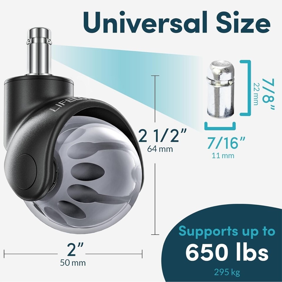 Reliable Heavy-Duty Performance ? With a remarkable load capacity of 650 lbs, our office chair wheels ensure stability and strength, providing reliable mobility for your office whether you're in high-pressure environments or relaxing at home.