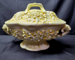 sheep and grapevines. Features a handled cover over a footed deep bowl, which