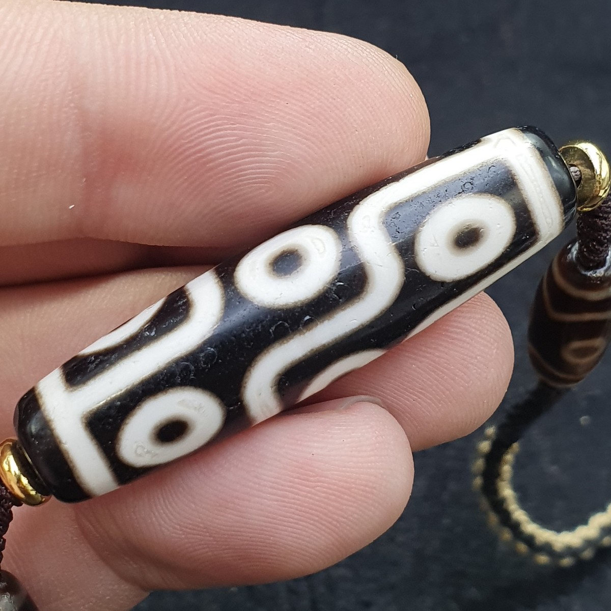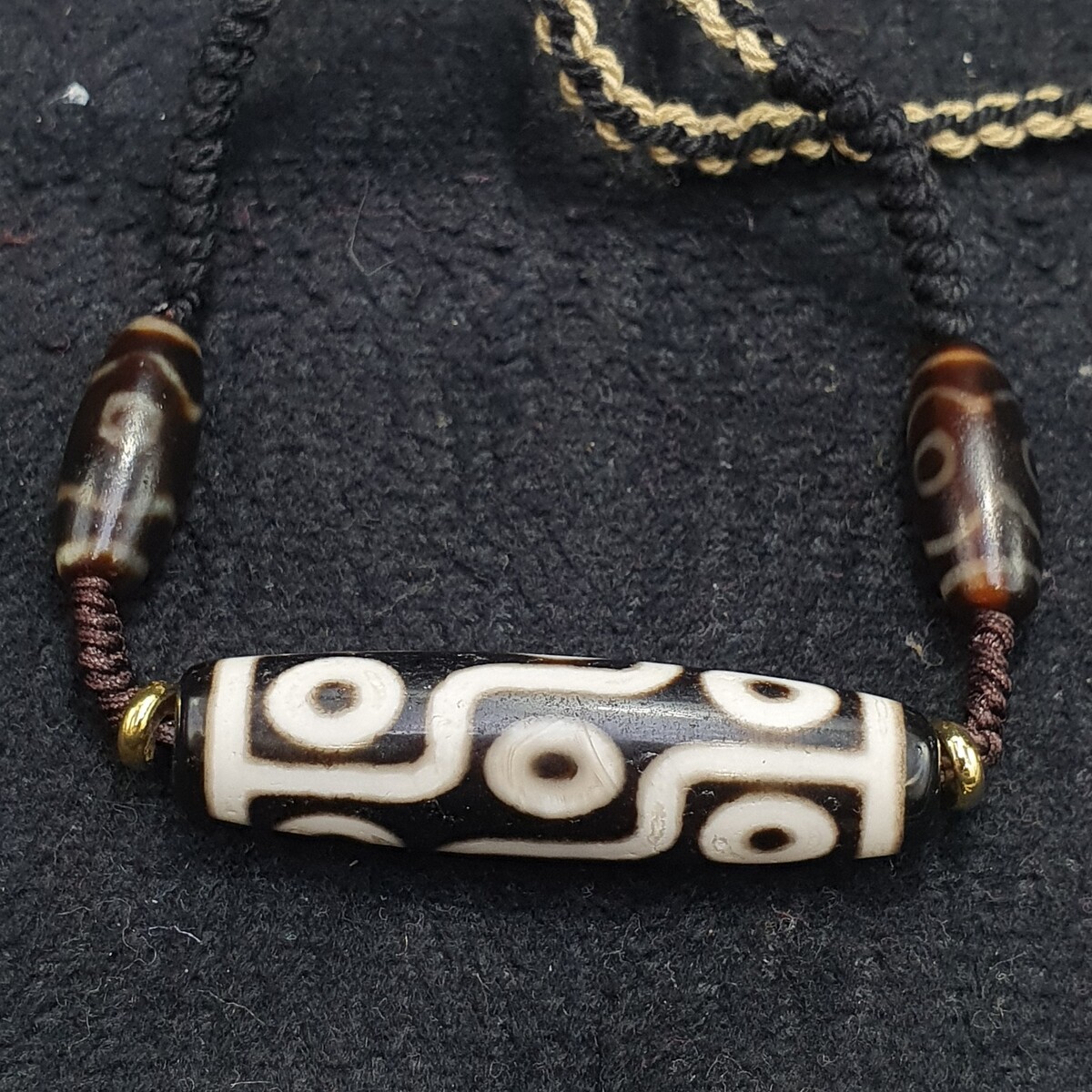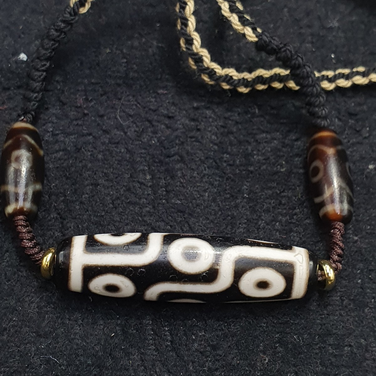 Central bead: Elongated with symmetrical white motifs?circles and lines?on a dark base, typical of high-quality etched Dzi.