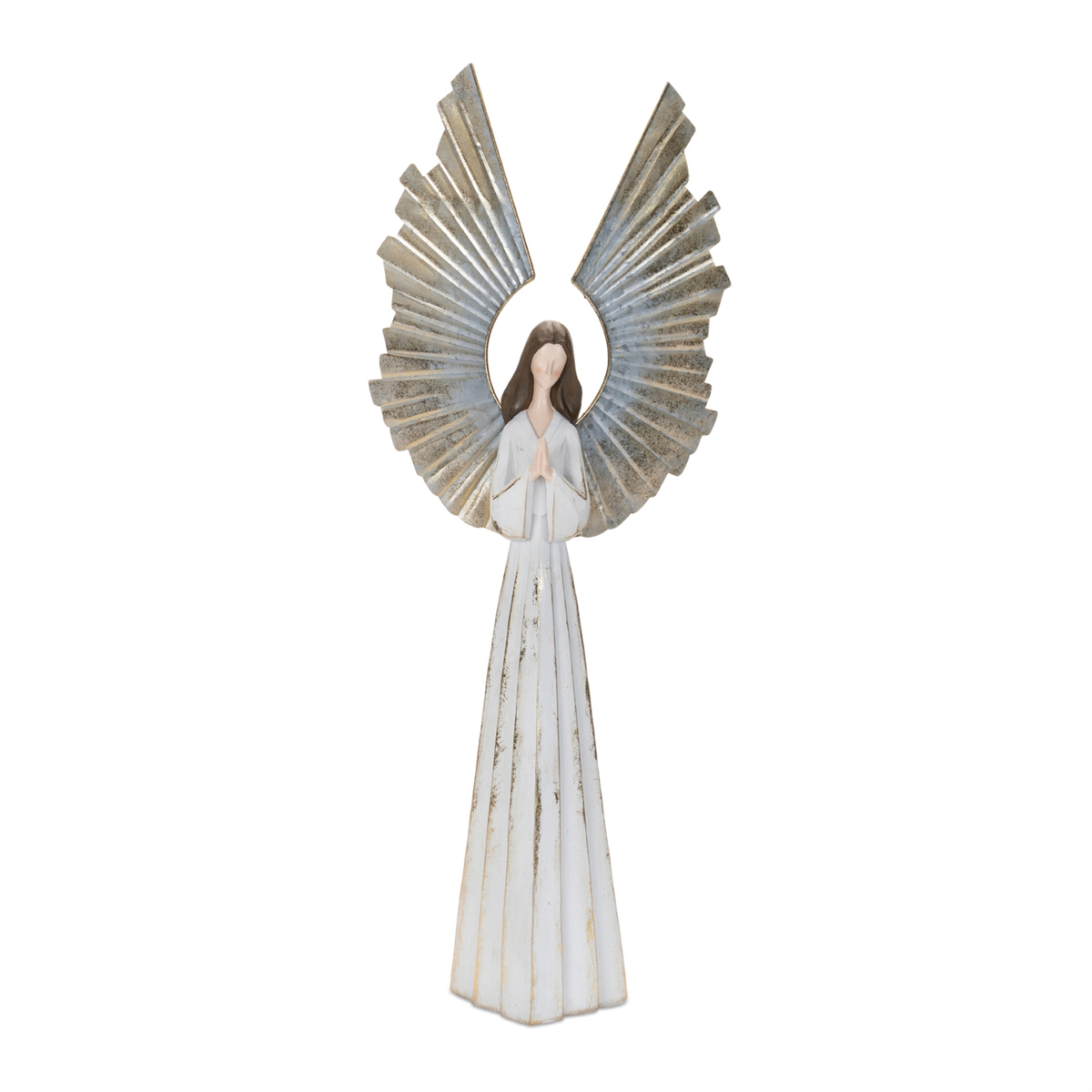 Make a graceful statement this holiday season with this stunning holiday angel statue. Crafted with elegant white and gold tones, this serene figure radiates peace and sophistication. The angel s flowing robes and calm expression are complemented by distressed metal wings and a subtle gold brushed finish, adding dimension and a vintage-inspired charm. Perfect for larger spaces, this impressive statue enhances mantels, tabletops, or entryways when paired with nativity sets, seasonal floral arrangements, or holiday trees.