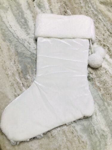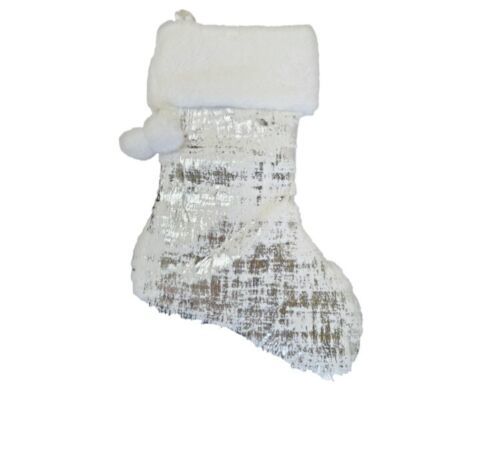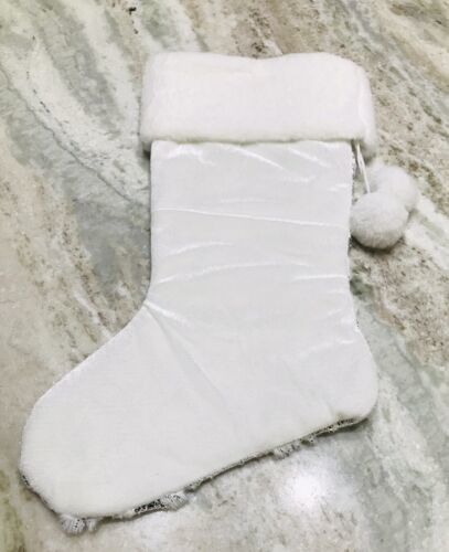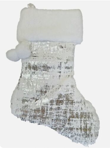- Holiday Christmas Stocking Metallic Silver & White Faux Fur with PomPoms 16”.