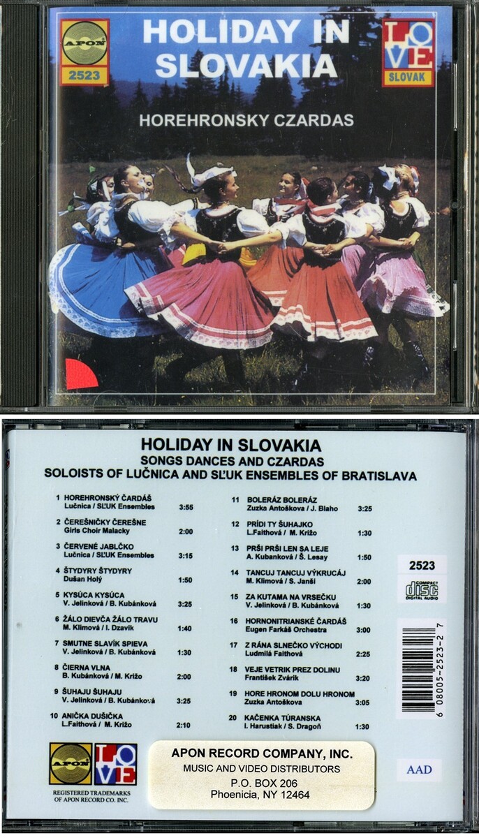 This is a new factory sealed CD of HOLIDAY IN SLOVAKIA. The album Holiday in Slovakia: Songs, Dances, and Czardas features the renowned Lúcnica and SLUK (Slovak State Traditional Dance Ensemble) ensembles of Bratislava, which are prominent representatives of Slovak national culture and folklore.