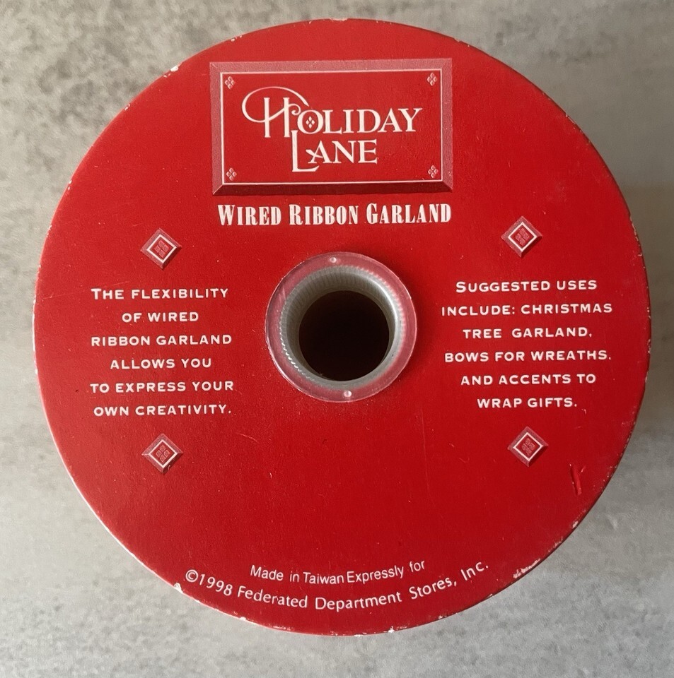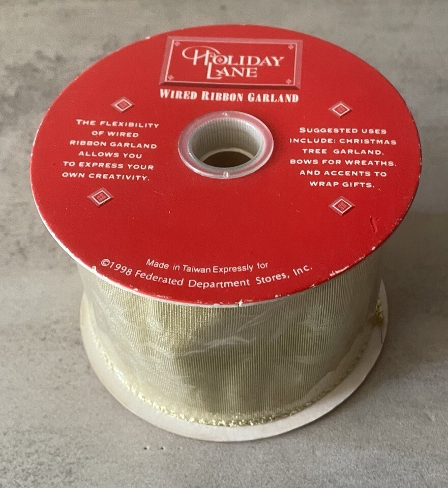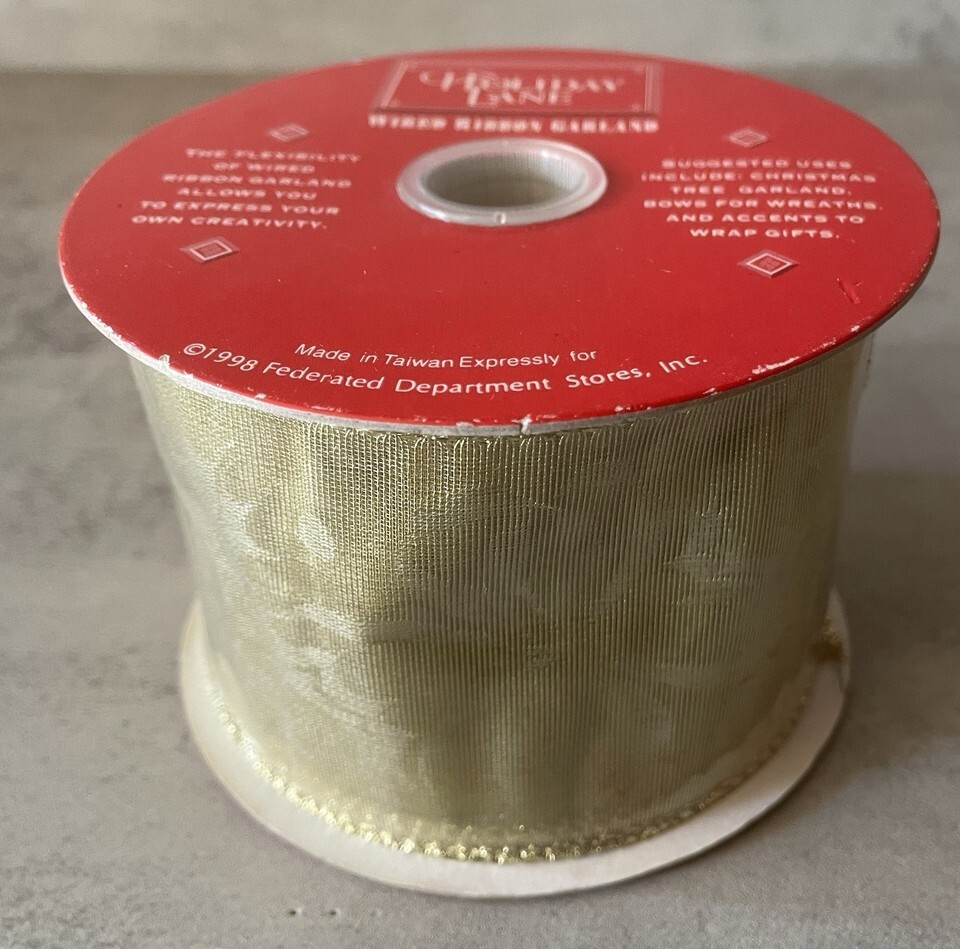 Holiday Lane wired ribbon garland roll, metallic gold velour style. Perfect for Christmas tree decorating, wreaths, bows, gift wrapping, crafts, floral arrangements, and holiday displays.