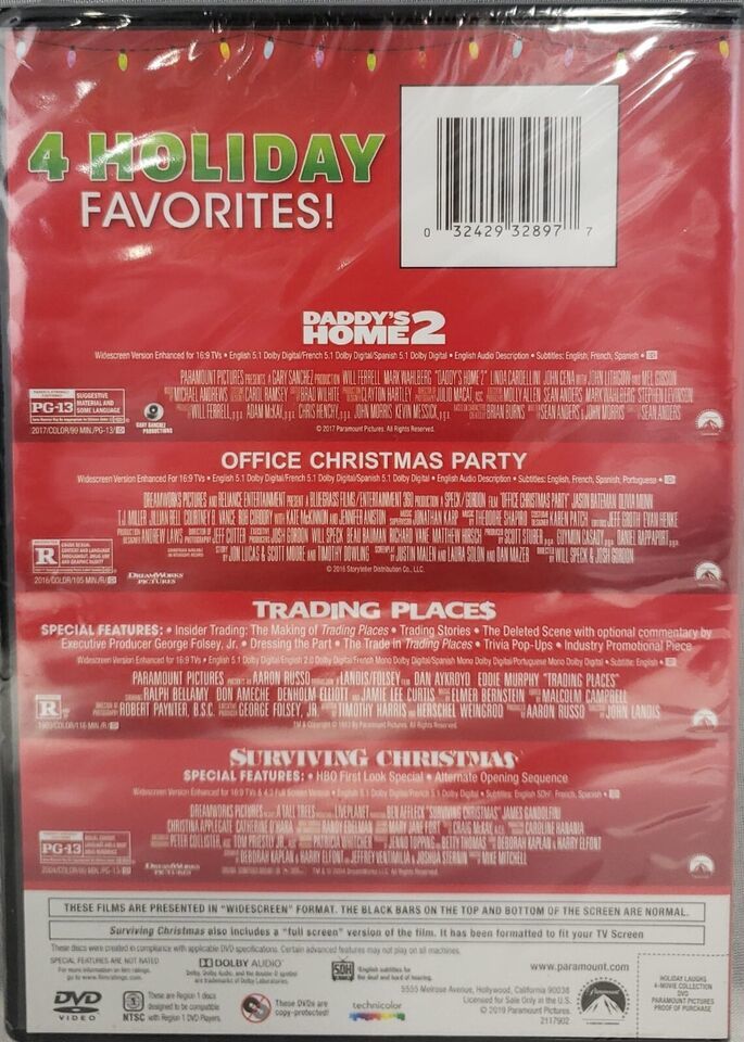 Trading Places: What happens when you combine the comic genius of Eddie Murphy with Dan Aykroyd and director John Landis. You get a timeless comedy classic laced with sidesplitting, satiric humor. Murphy stars as a small-time con artist who gets a chance to switch lives with Aykroyd's big-time stock market maven. But their reversal of fortunes is just a cruel joke perpetrated by two bored mega-rich brothers (Don Ameche and Ralph Bellamy) as part of an idle bet. When the truth comes out. The consequences are sheer comedy gold! Surviving Christmas: Directed by Mike Mitchell, Surviving Christmas finds Drew Latham (Ben Affleck) uneager to spend another lonely Christmas in his own home. Longing for holidays past, Drew travels to his childhood home intending to relive the experience of a family Christmas unfortunately, his family no longer lives there. This represents only a small snafu to Drew, who offers the Valco patriarch and his wife (Sopranos star James Gandolfini and Catherine O'Hara) a huge amount of money if they consent to pretend they are his parents and that he is a cherished member of the family. This entails participating in Latham family traditions, such as Christmas tree selection and crowded holiday shopping excursions. Though the Valcos reluctantly go along with Drew's requests, Alicia, their eldest daughter, arrives at home and refuses to comply with her 'brother's' wishes. Daddy's Home 2: Get ready for the Daddy of all family comedies! When it comes to raising their kids, Dusty (Mark Wahlberg) and Brad (Will Ferrell) finally have this co-parenting thing down. That is, until Dusty's macho dad (Mel Gibson) and Brad's sweet-natured father (John Lithgow) come to town, throwing the whole family into complete chaos. As old rivalries create new problems, Dusty and Brad's partnership is put to the ultimate test in this "hilarious and heartwarming" (Melissa Northway, Dandelion Moms) comedy that gives new meaning to the term 'blended family'. Office Christmas Party: InOffice Christmas Party, when the CEO (Jennifer Aniston) tries to close her hard-partying brother's branch, he (T.J. Miller) and his Chief Technical Officer (Jason Bateman) must rally their co-workers and host an epic office Christmas party in an effort to impress a potential client and close a sale that will save their jobs. The latest comedy from directors Josh Gordon and Will Speck (Blades Of Glory) co-stars Kate McKinnon, Olivia Munn, Jillian Bell, Rob Corddry, Vanessa Bayer, Randall Park, Sam Richardson, Jamie Chung, and Courtney B. Vance in the funniest movie of the holiday season.