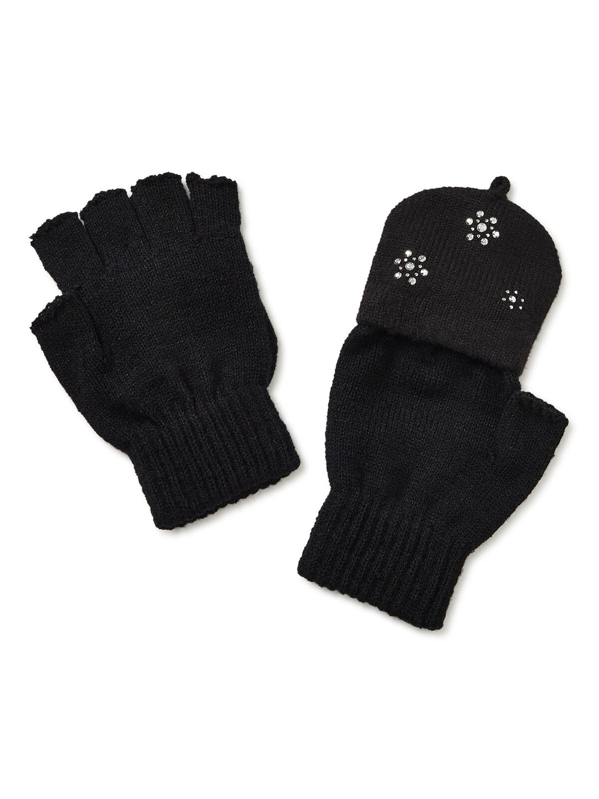 Gloves features: Pull-on styling; flip mitten top for added warmth; rhinestone snowflake accents