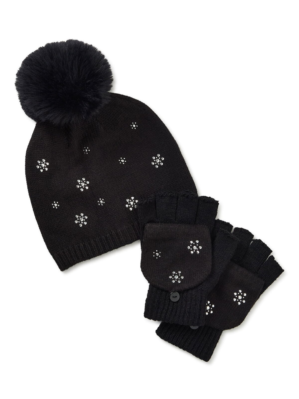 - Holiday Time Women's Winter Hat & Fingerless Gloves Snowflake Set black One Size