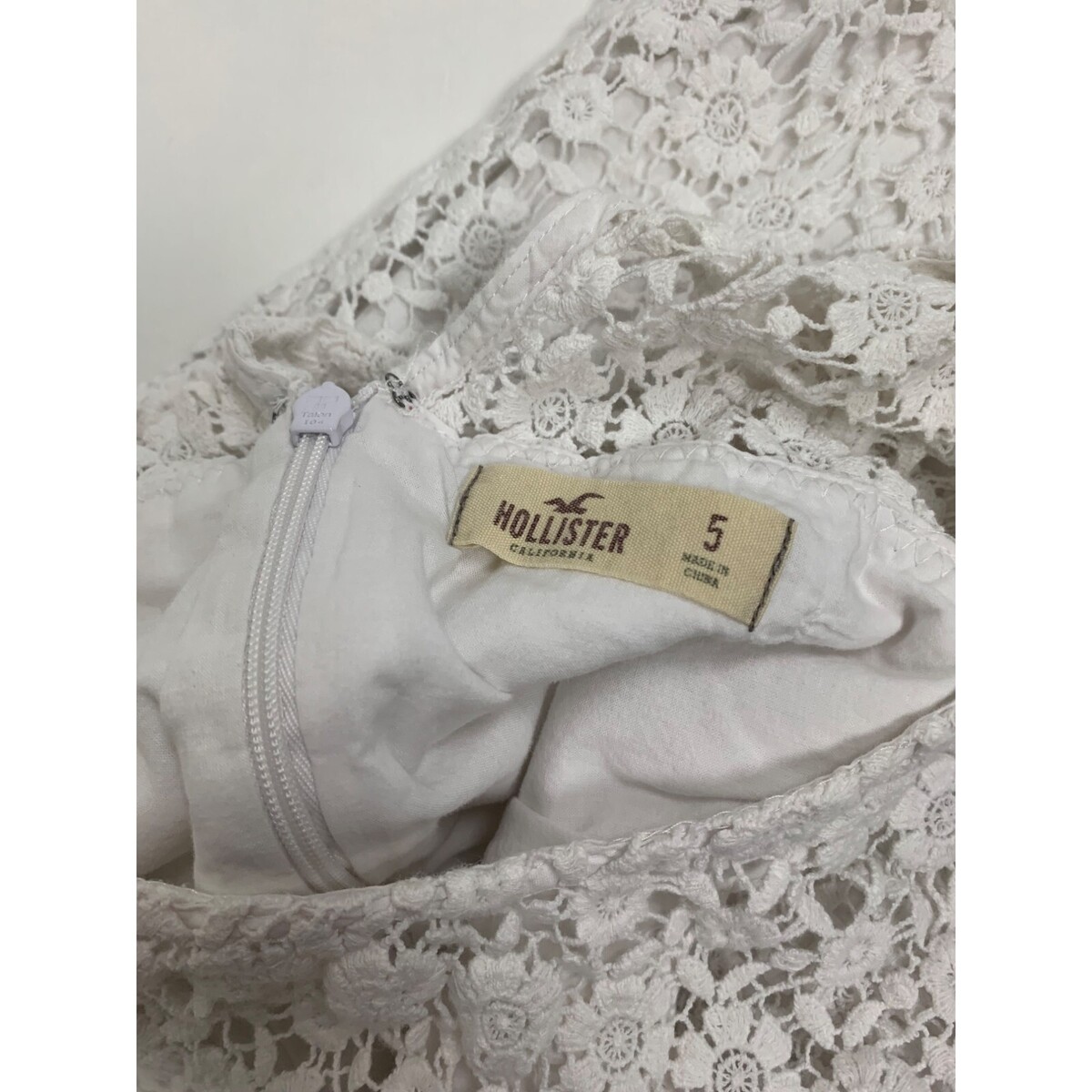 Elegant white floral lace sleeveless dress by Hollister, ideal for formal events or casual outings. Features a back zipper for easy wear.
