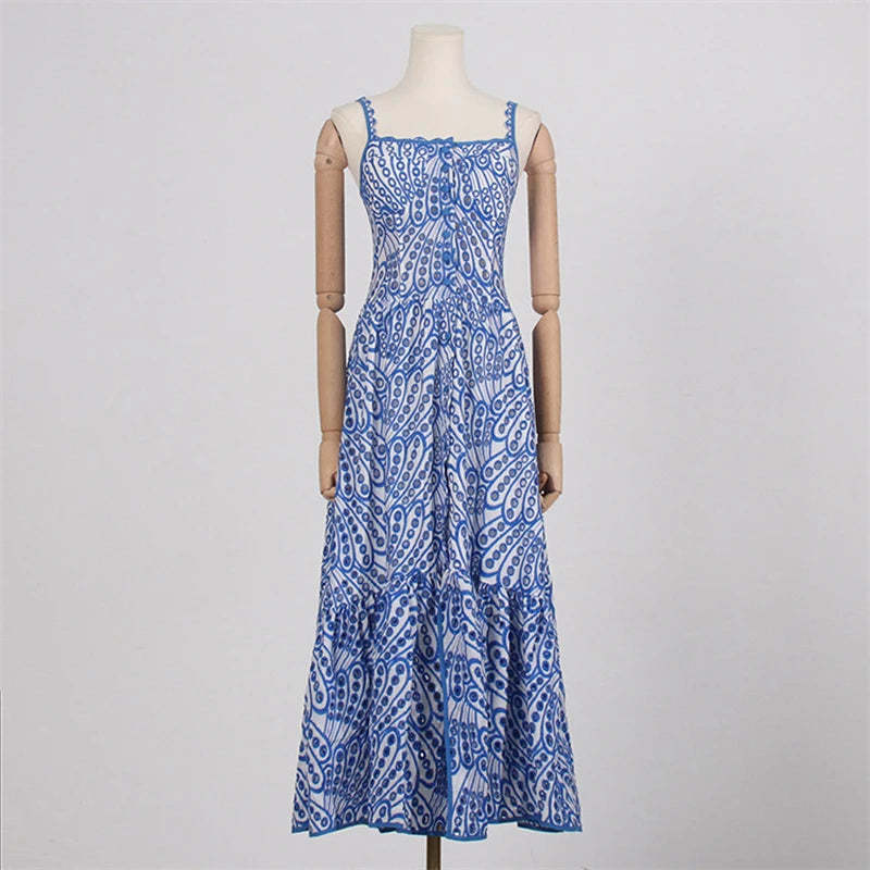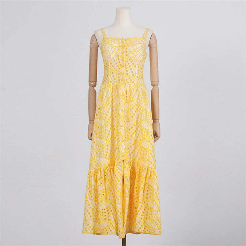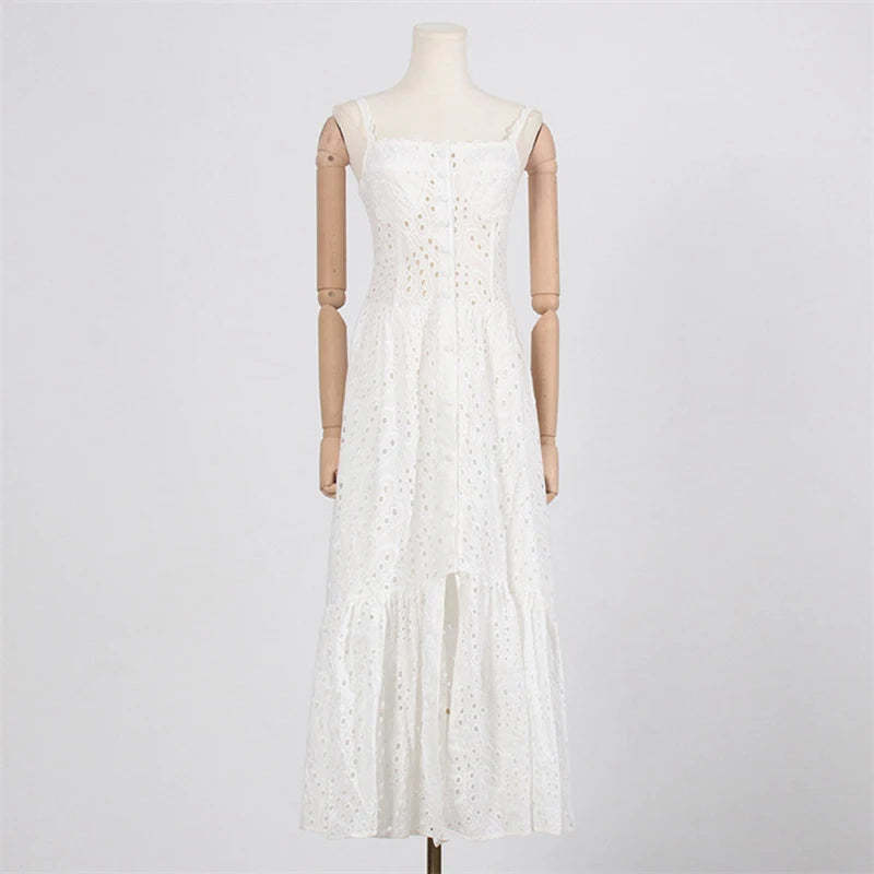 Introducing our Hollow out Lace Beach Sleeveless Slim Long Dresses - the epitome of elegance and sophistication. Featuring intricate embroidery and a floral lace pattern, this Ankle-Length dress is designed to enhance your silhouette in a Slim A-Line shape. Made from a luxurious blend of natural fibers and polyester, this dress exudes a vintage charm. With a Square Collar neckline and delicate straps, this dress is perfect for a summer getaway. Made in Mainland China, in the province of Zhejiang, this dress is imbued with craftsmanship and quality. The Full Sleeves and Empire Waistline add an extra touch of allure. Dress to impress with our exclusive creation, available in summer 2024.