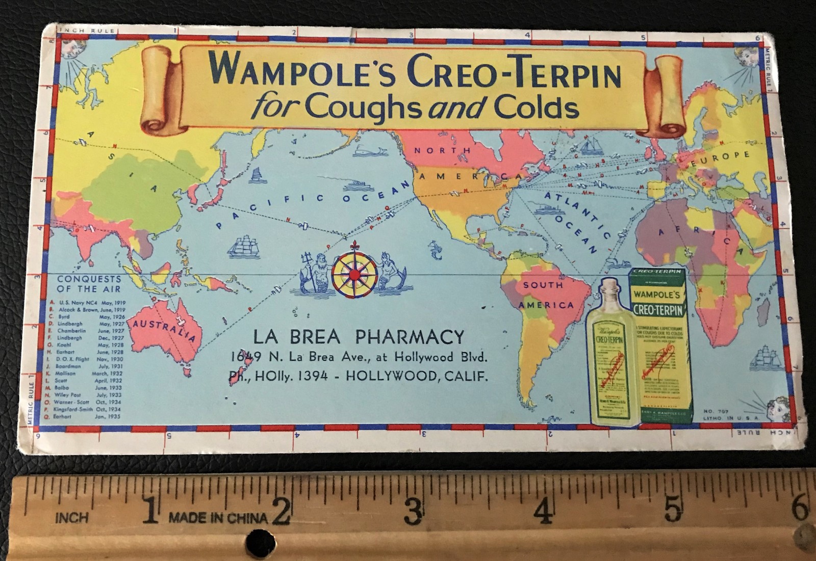 Up for sale in this listing a fantastic vintage Wampoles Creo-Terpin advertising trade card. It features a world map plotting major conquests of the air occurring from 1910-1936. It is in good condition for it's age, 1915ish.