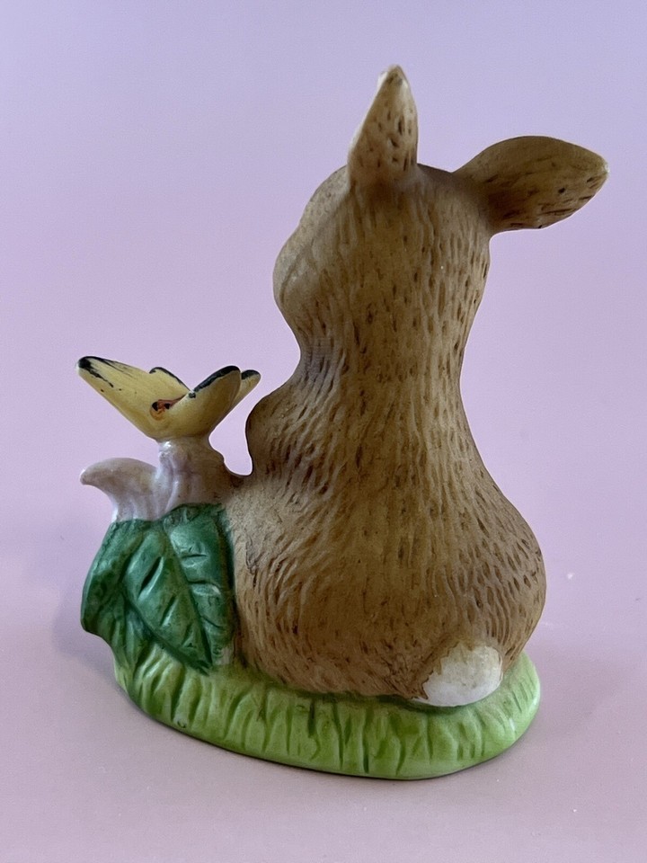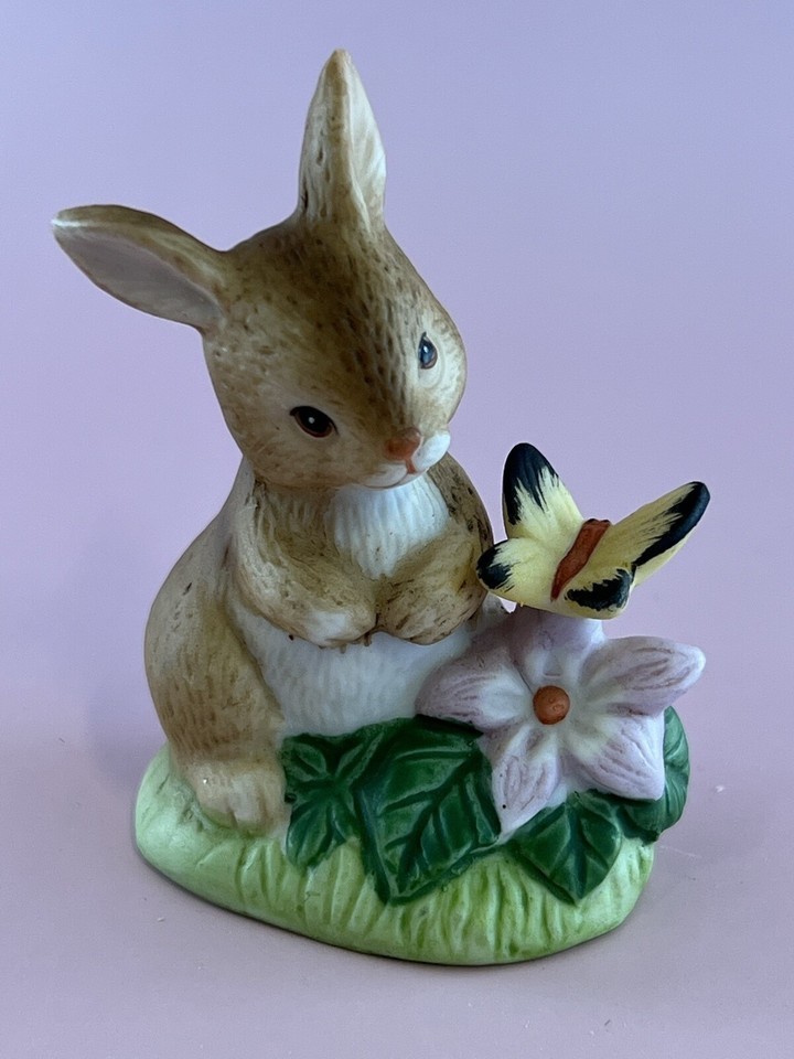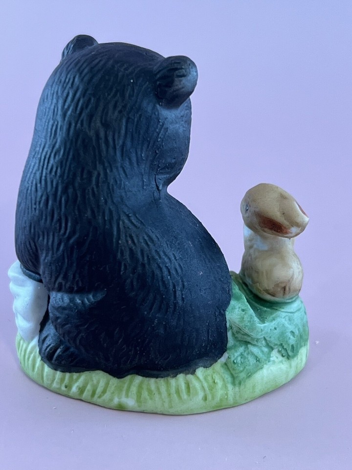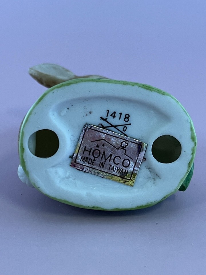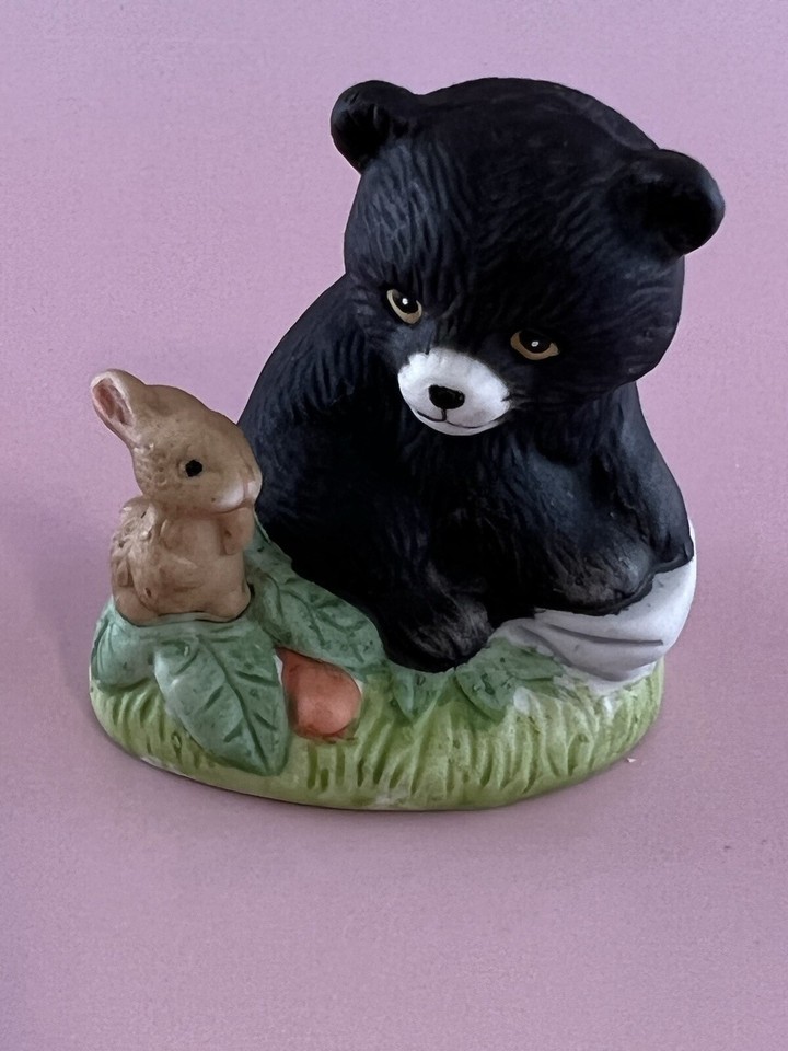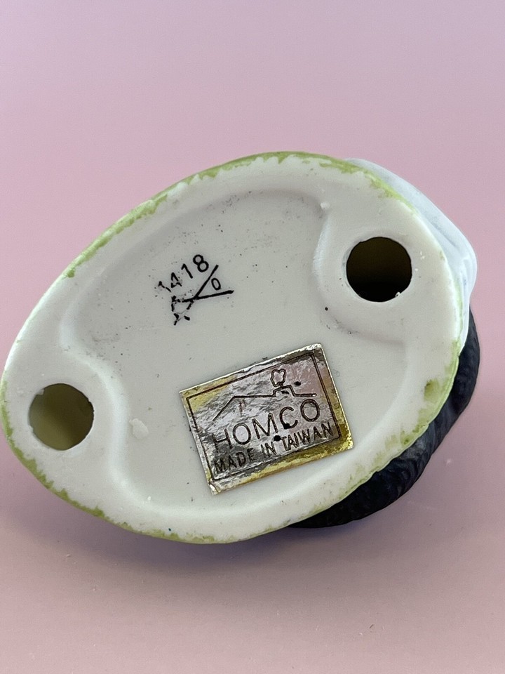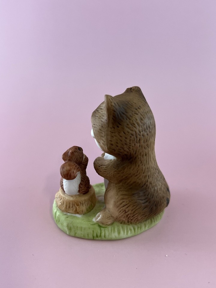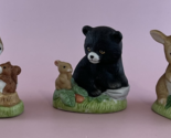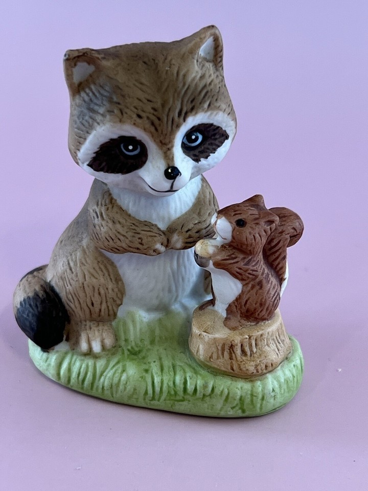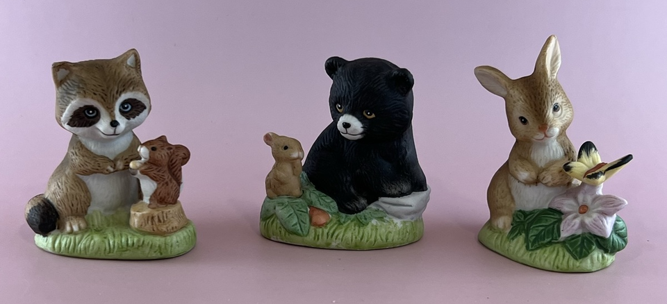 A vintage 3 piece set of HomCo 1418 porcelain figurines. This set features a racoon with a squirrel, a bear with a bunny, and a bunny with a butterfly. Each figurine is approximately 2.5 inches in height. The base of each figurine measures approximately 2 inches x 1.5 inches. These figurines are in excellent condition with no chips or cracks. The figurines were made in Taiwan.