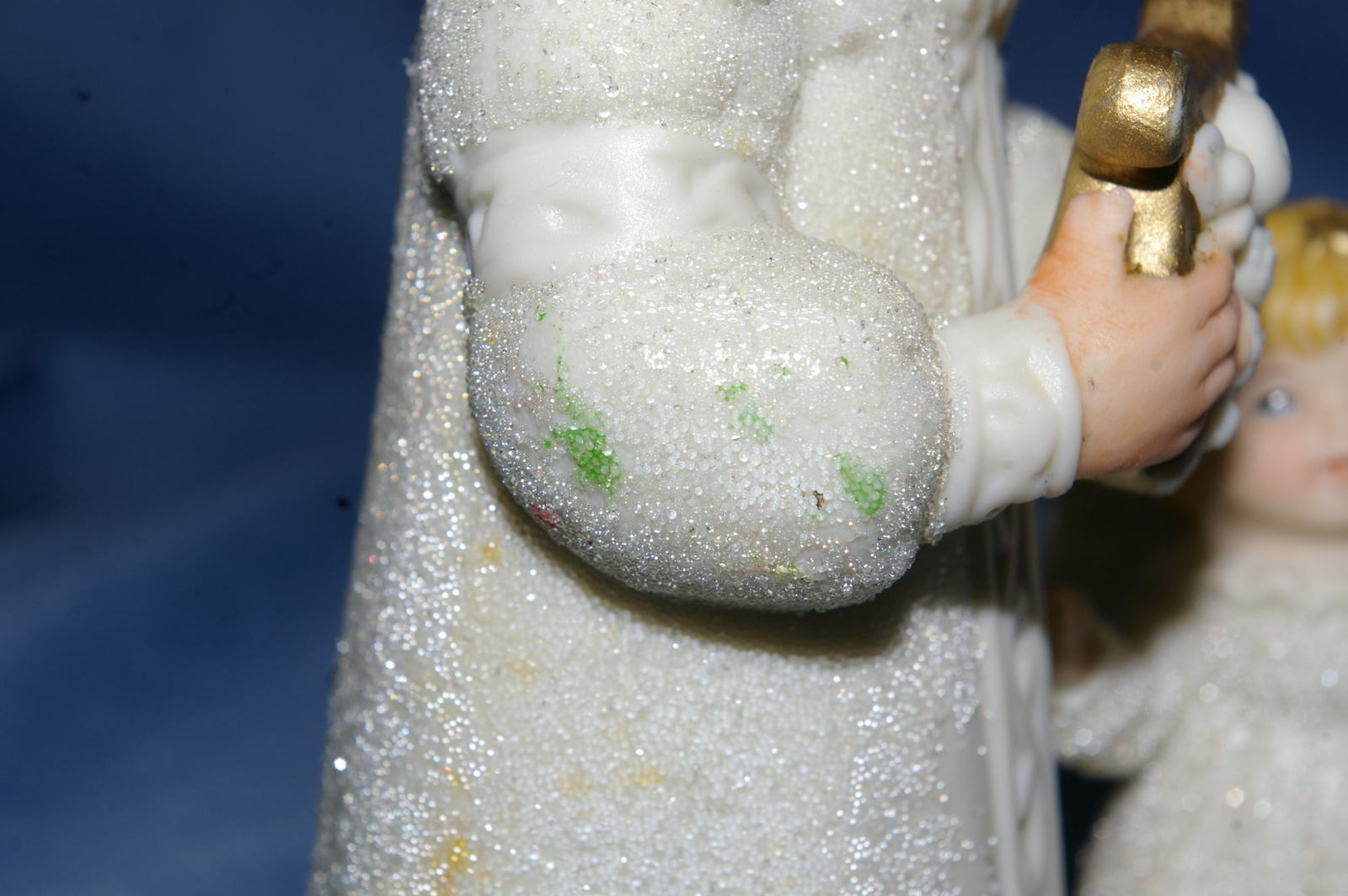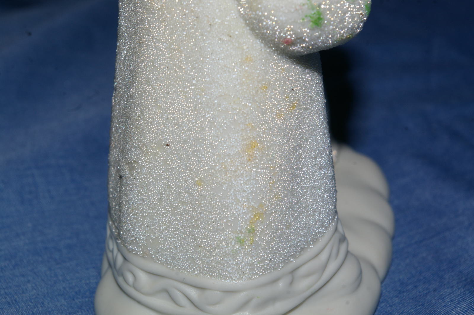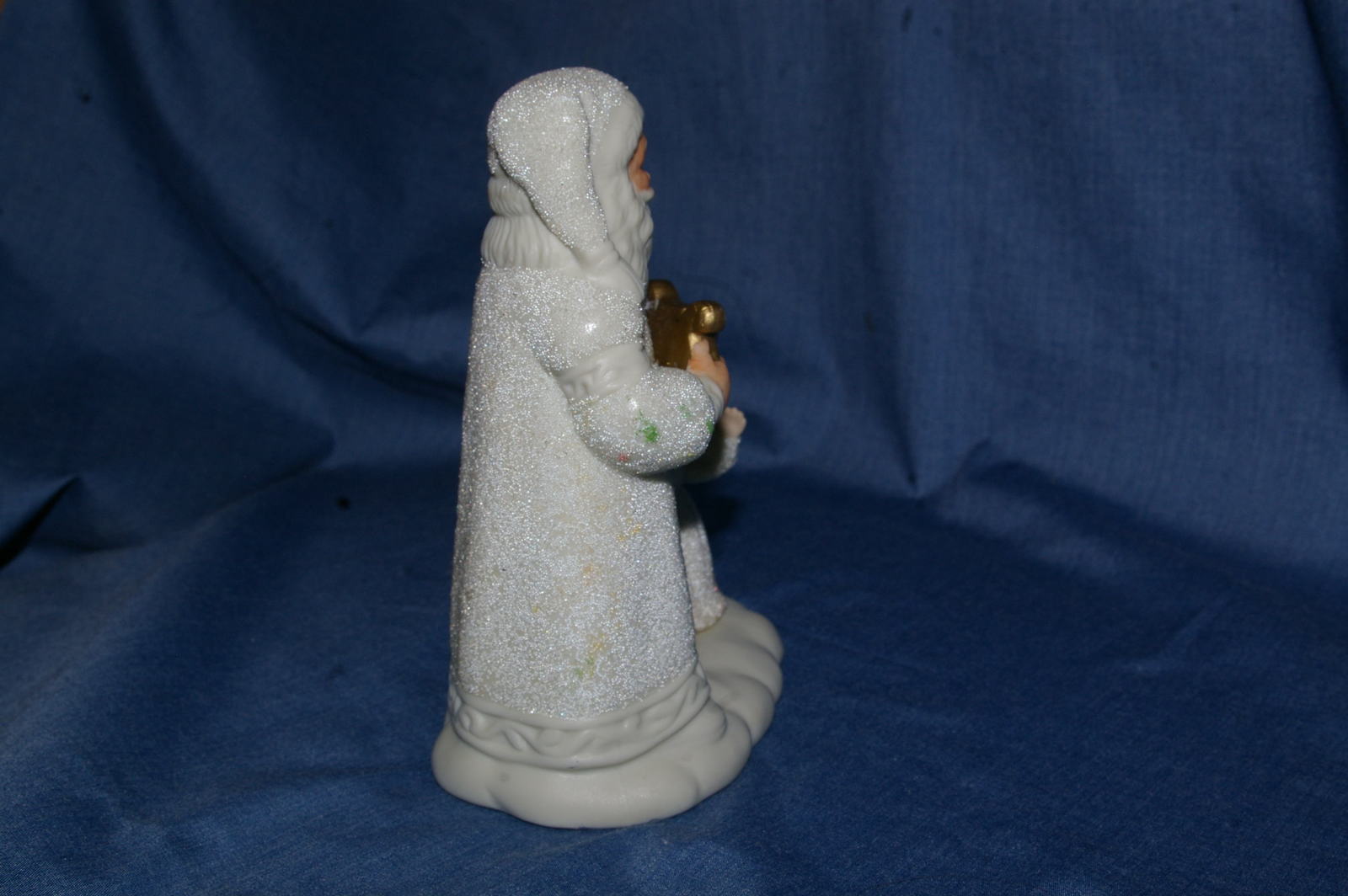 It is in good used condition, no chips or cracks. It shows sign of age with discoloration/yellowing, some of the glittery surface worn off and there is some aged glue where the angel is attached to the base. I don’t know if it has been reglued of if it is from manufacture. It, also, has some smudges of paint or wax on the back and arm of Father Christmas from storage.