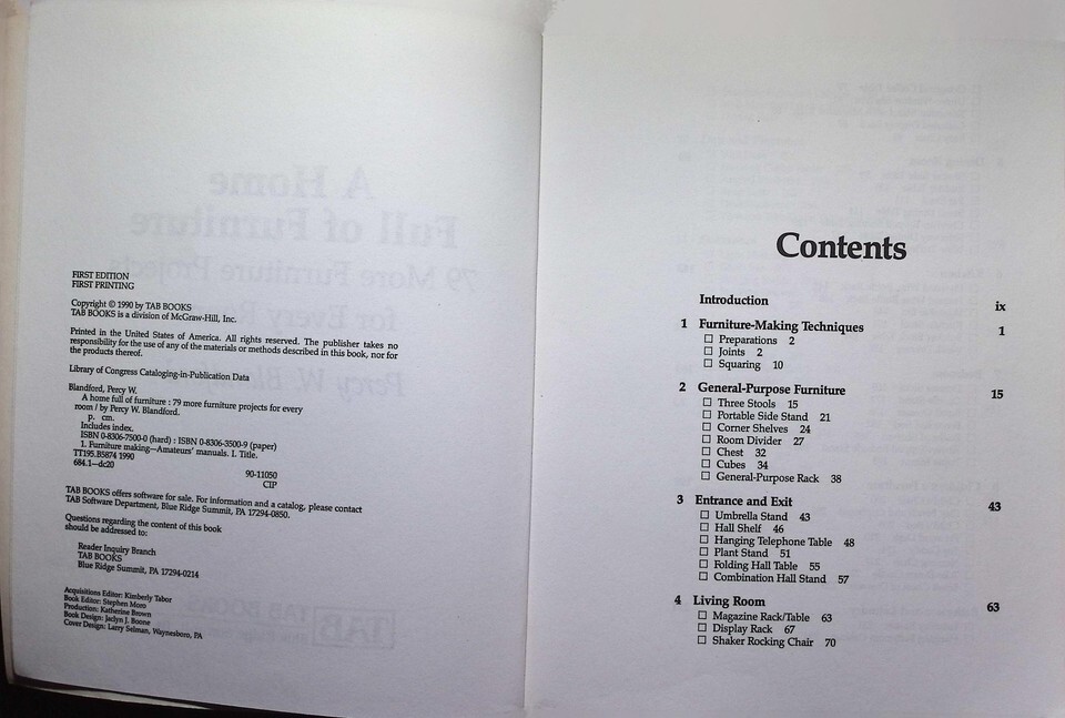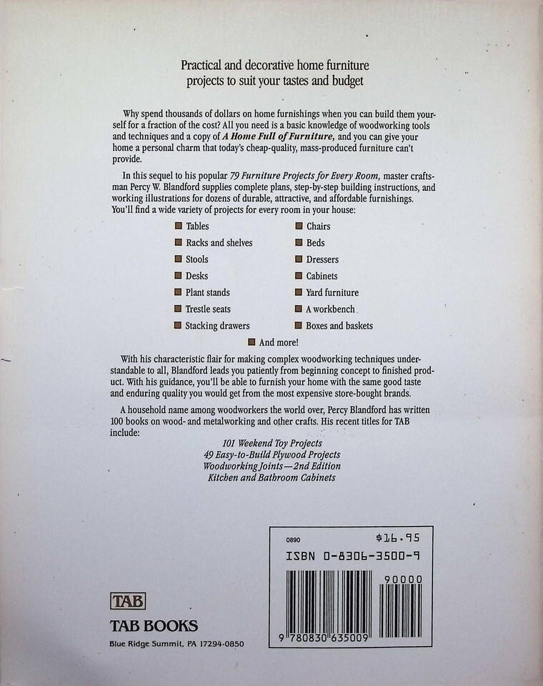 Discover the joy of woodworking with 'Home Full of Furniture' by Percy W. Blandford. This collectible First Edition, First Printing guide is perfect for amateur builders, featuring 79 furniture projects that are both solid and attractive. The book provides clear instructions for making items like stools, shelves, tables, and even a Shaker rocking chair. This specific copy is in good condition with clean, unmarked interior pages, making it an excellent resource for DIY enthusiasts and collectors of classic woodworking manuals.