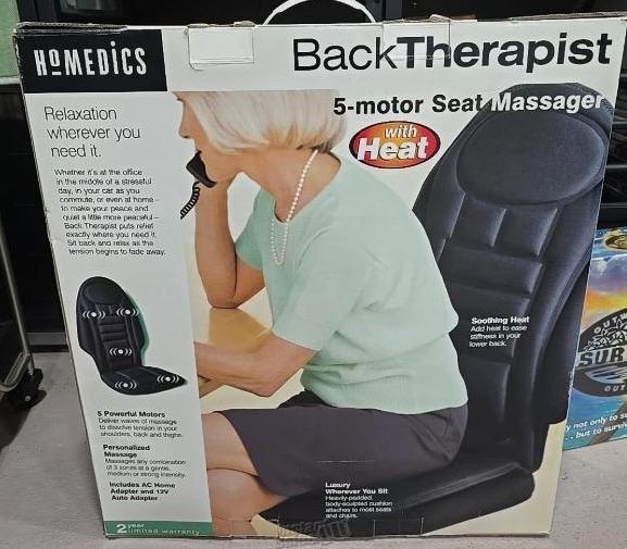 Homedics 5-Motor Seat Massager w/Heat - Back Therapist. Back Therapist 5 motor seat massager. It has the straps on the back to attach to a chair. Open box, tested and working