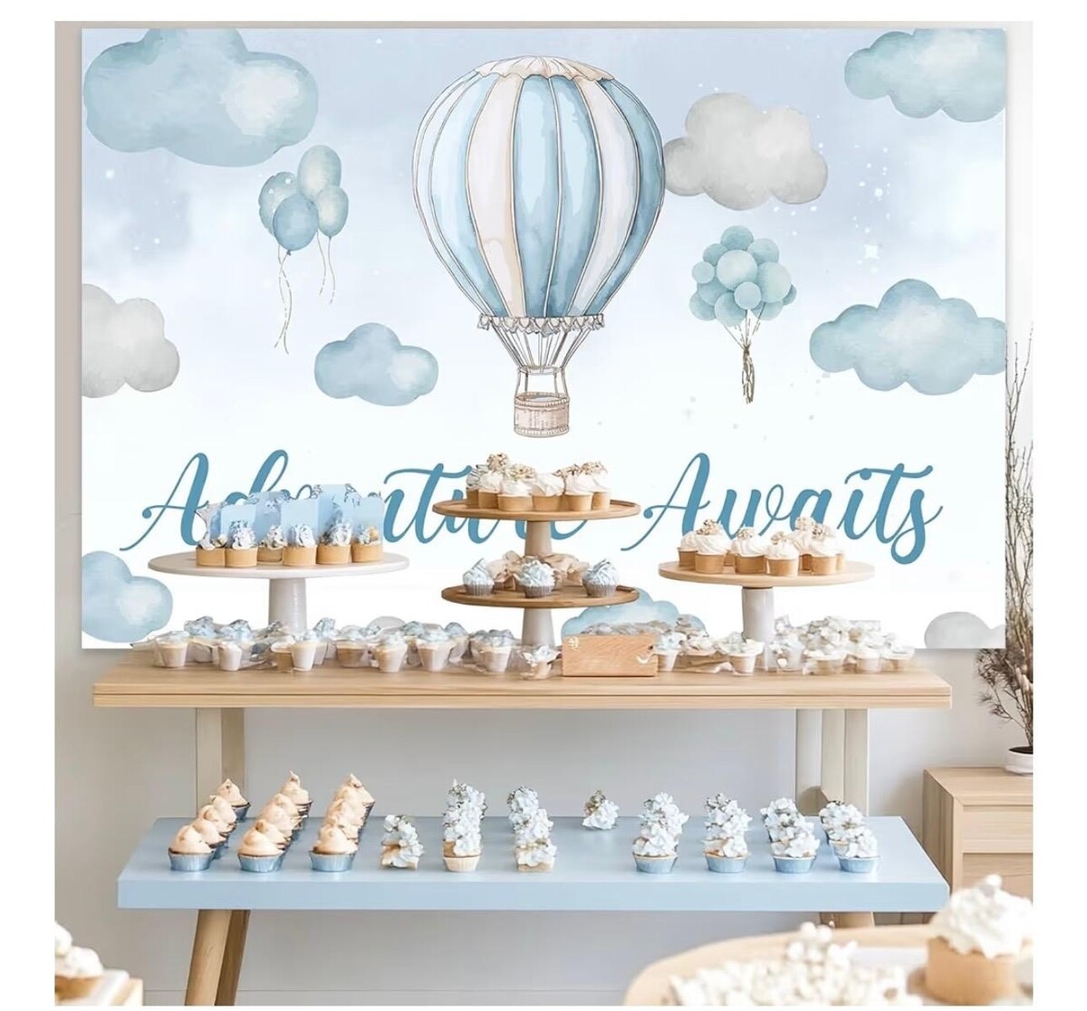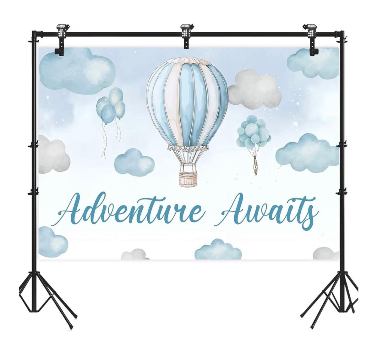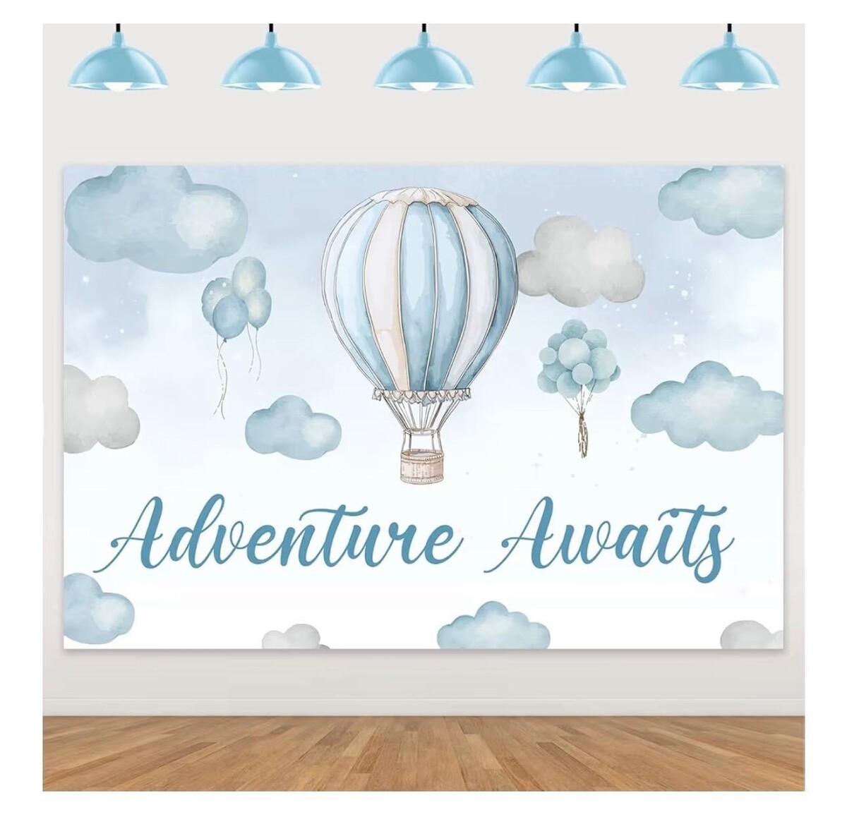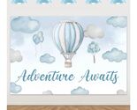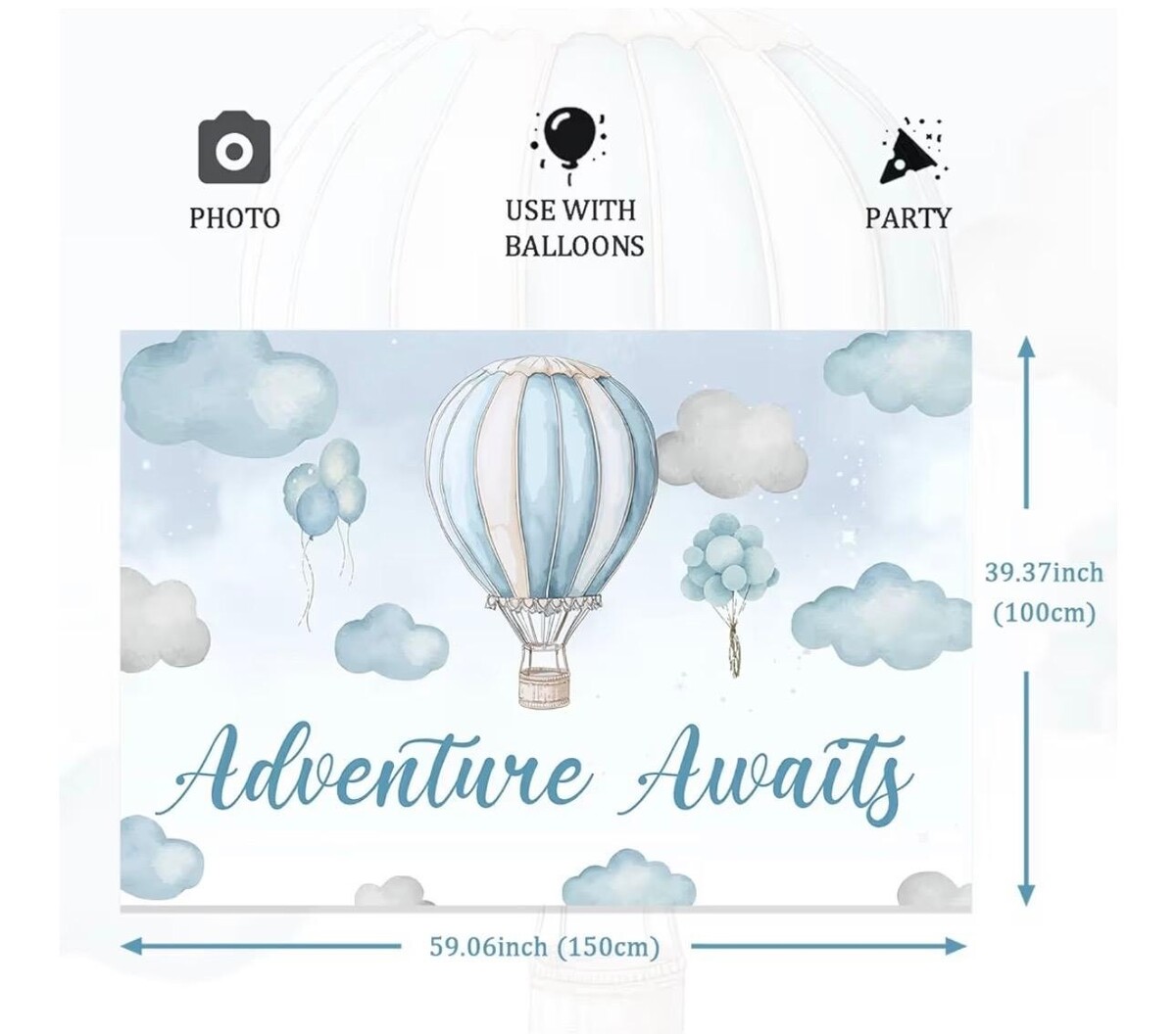 Hot air balloon photo backdrop, blue and white sky with clouds, backdrop for hot air balloon photoshoot, adventure awaits, travel-themed baby shower decoration, birthday and baby shower party supplies, 1.5 x 0.9 meters with a set of 30 white, blue, and silver balloons in various sizes