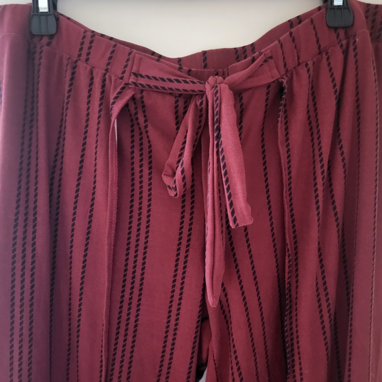These maroon wide leg pants are still in great condition. They have a tie design on the front and also an open layered leg design as pictured.
