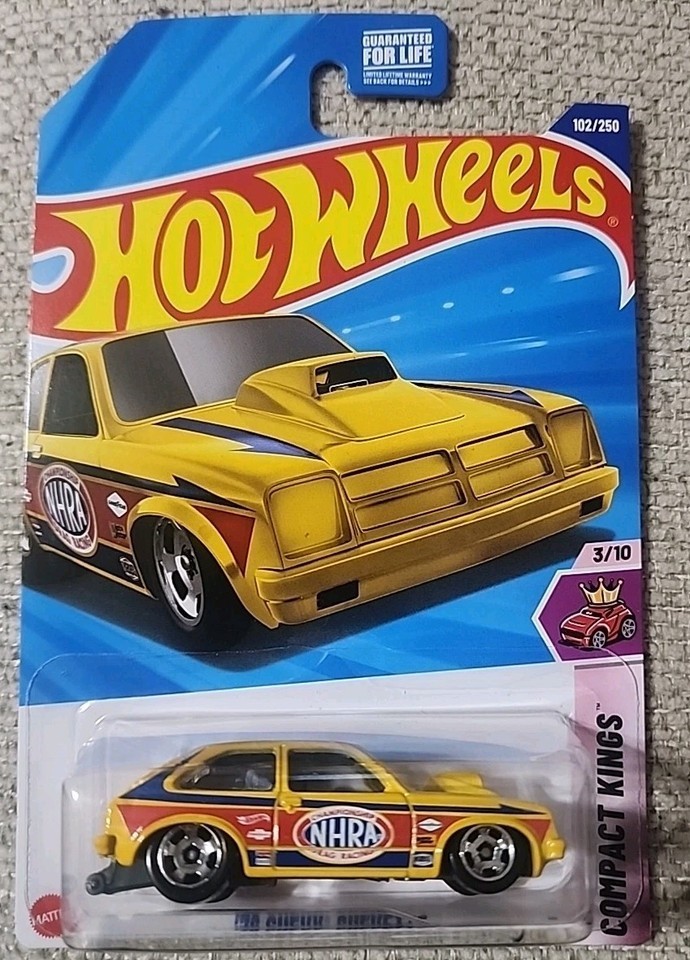 The Chevy Chevette model is part of the Hot Wheels Compact Kings series and was manufactured in Malaysia in 2024. It features the iconic Chevrolet brand and is recommended for ages 3 and up. This toy car is a great gift for any car enthusiast or Hot Wheels collector.