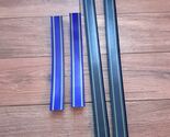 Not sure if this is hot wheels track or from the Kenner Fast 111's Burn Out Alley set. Includes 2 long darker/navy track pieces and 2 royal blue pieces(some bending as shown, but could be flattened) Both have green/yellow stripes. See pics for measurements.
