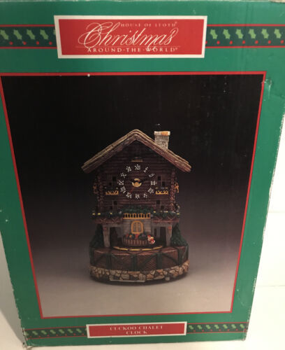 House Of Lloyd Christmas Around The World Cuckoo Chalet Music Clock. 10" tall by 7" wide. It is in its original box. It is in good condition. Great piece to decorate your Christmas's village.