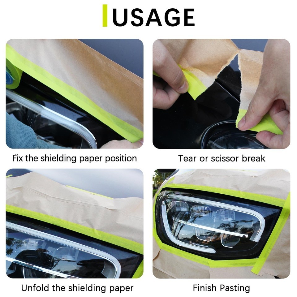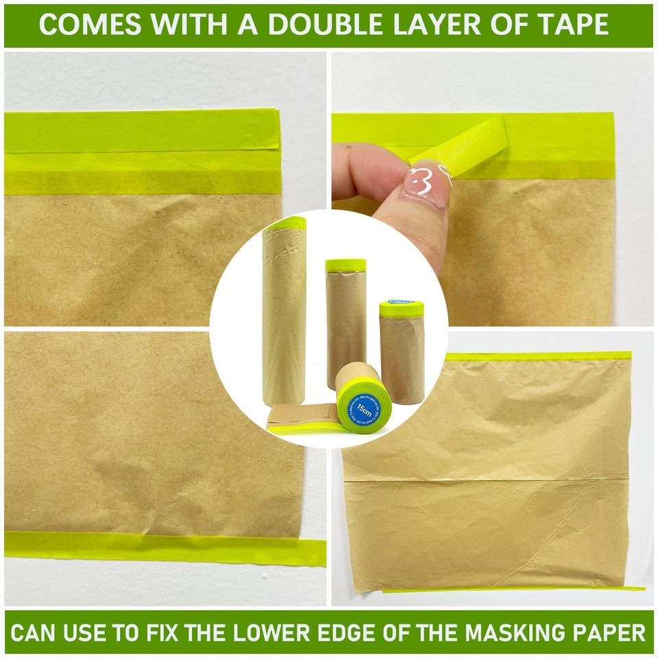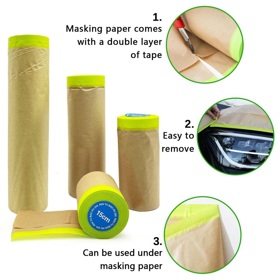 Hubaow Masking Papers for Automotive Painting, Tear Resistant Masking Film with Tape, Pre-taped Car Paint Protection Covering SPECIFICATION: Material: Made of premium paper and tape, with premium waterproof effect Dimensions: 12 in x 200 feet Package Include: 4 x 12 masking paper (each roll is 50 feet, total 200 feet) FEATURE: Self-adhesive Function: High tack masking tape, resists tearing, strong and high penetration resistance, when Kraft paper is covered, it can be freely attached to the surface of objects such as the automotive body, furniture and the wall surface to ensure complete protection, which also has the right size for the protection of skirting boards, architraves, window frames and light switches Easy to Remove: It's easy to remove, leaving sharp lines, no bleed, without adhesive traces, but it is highly resistant at the same time Easy to Use: The tape and drape is easy to use and covers well protected area, you don't need to worry about paint splashing on the floor and wall, they can well protect the shelter and remove without leaving a trace, applicable to the automotive field, home decoration, etc Durable Paint Masking Paper: Painting paper is durable, it is tough and unbreakable to prevent leakage, which will provide a waterproof cover between any potential spilled paint and your furniture or floors Wide Range of Applications: You can use them according to your actual needs, the main function of automotive paint paper roll with tape is to guard the protective areas from paint, which can be widely applicable for automotive paint, equipment coverage and appliance protection, such as vehicles, boats, floors, stairs, doors, and so onthey can keep surrounding surfaces away from overspray, provide clean paint lines and remove easily when finished