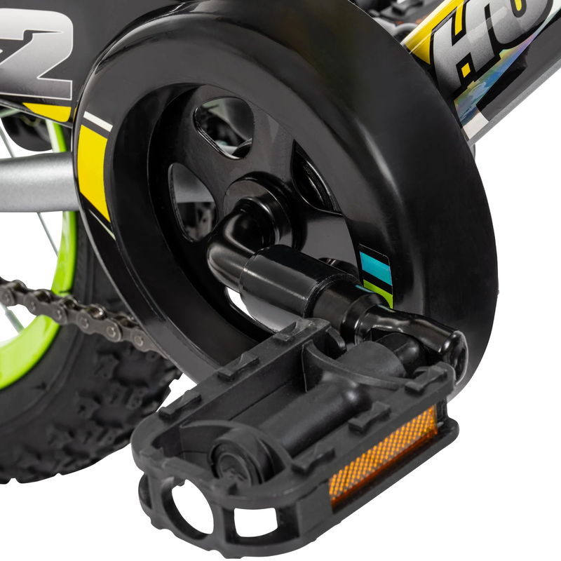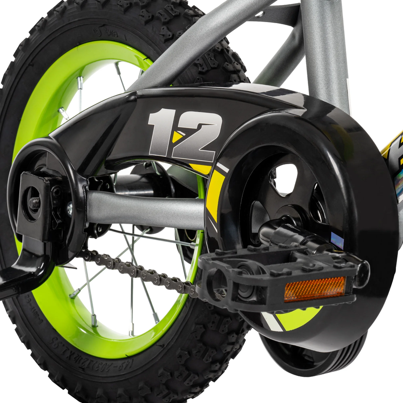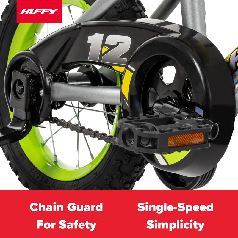 Bold, Rugged Style: Sleek matte gray frame with bright lime accents and racing-inspired graphics for a cool, standout look. Easy Riding: Single-speed design and smooth-rolling tires make pedaling effortless for young riders. Safe Braking: Rear coaster brake allows for simple, easy stopping?just pedal backward to slow down safely. Extra Stability: Removable training wheels provide extra support while helping kids gain confidence as they learn to ride. Comfortable Seat: Adjustable padded seat grows with your child, ensuring a comfy and secure fit for every ride. Durable Frame: Strong steel frame built to handle everyday adventures, offering long-lasting performance. Perfect Fit: Designed for growing riders, with an adjustable seat and training wheels that can be removed when ready. Age Group: 3 to 5 years old. Character Group: Huffy