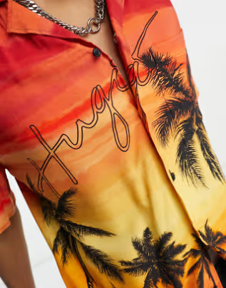 HUGO helps you make a statement with this Straight-fit shirt, showcasing a sunset-inspired print and signature logo graphic at the front.