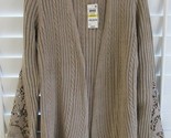Description: Up for sale is an International Concepts (NWT) women's open-front cardigan sweater. The size is medium. The color is light tan in color.The sweater is made of 57%cotton/38%acrylic/5%nylon knit fabric. This cardigan has a ribbed design with accent cabling and features bell sleeves with crochet inserts . This open-front cardigan has an $89.50 price ticket attached.
