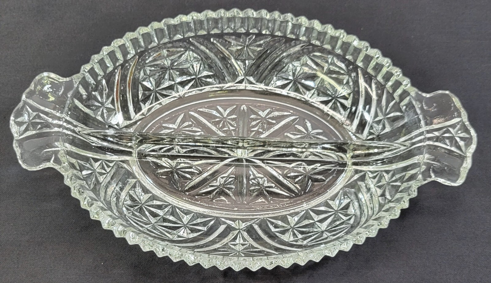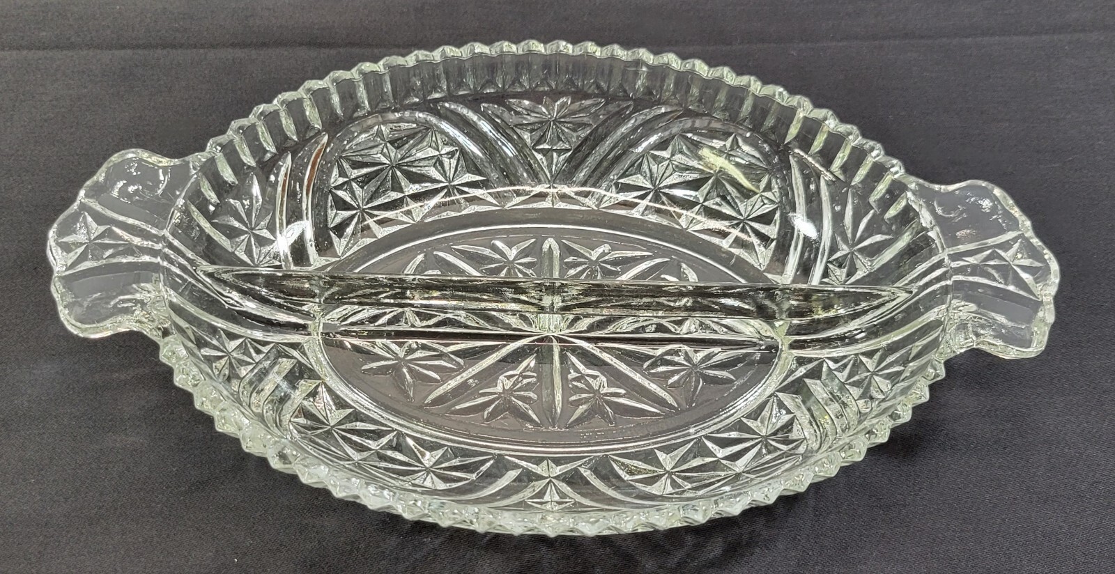 - I) Oval Half Split Clear Cut Glass Serving Dish Platter Bowl 10.5"