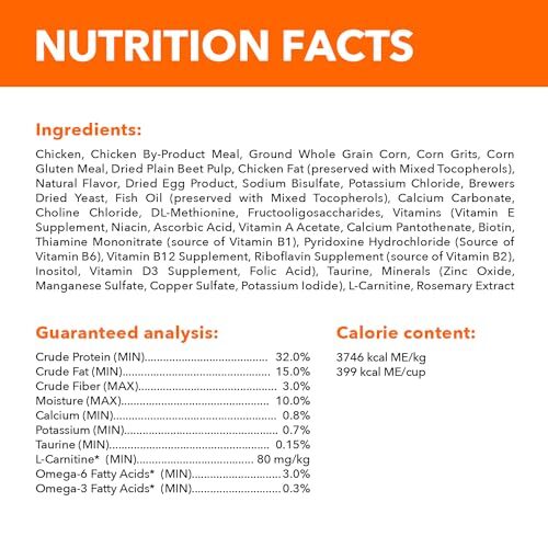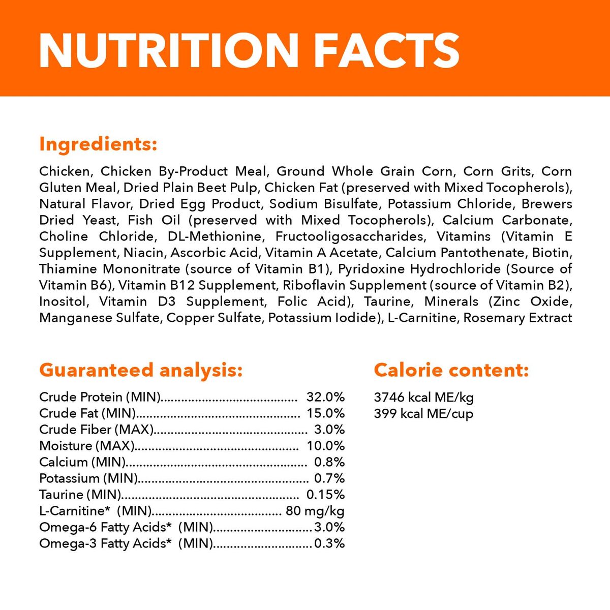 Ingredients: Chicken, Chicken By-Product Meal, Ground Whole Grain Corn, Corn Grits, Corn Protein Meal, Dried Plain Beet Pulp, Chicken Fat (preserved with Mixed Tocopherols), Natural Flavor, Brewers Dried Yeast, Dried Egg Product, Sodium Bisulfate, Potassium Chloride, Fish Oil (preserved with Mixed Tocopherols), Choline Chloride, Calcium Carbonate, DL-Methionine, Fructooligosaccharides, Citric Acid (preservative), Mixed Tocopherols (preservative), Taurine, Minerals (Zinc Oxide, Manganese Sulfate, Ferrous Sulfate, Copper Sulfate, Sodium Selenite, Potassium Iodide), Vitamins (Niacin Supplement, L-Ascorbyl-2-Polyphosphate, D-Calcium Pantothenate, Vitamin A Supplement, Biotin, Thiamine Mononitrate [Vitamin B1], Pyridoxine Hydrochloride [Vitamin B6], Vitamin B12 Supplement, Vitamin D3 Supplement, Riboflavin Supplement [Vitamin B2], Folic Acid), Vitamin E Supplement, L-Carnitine, Rosemary Extract.
